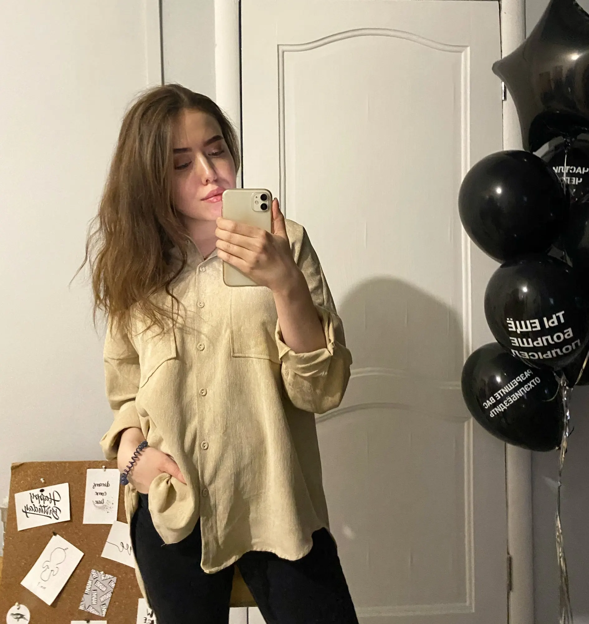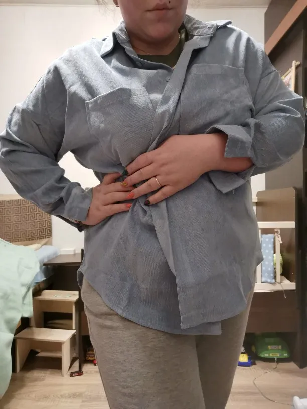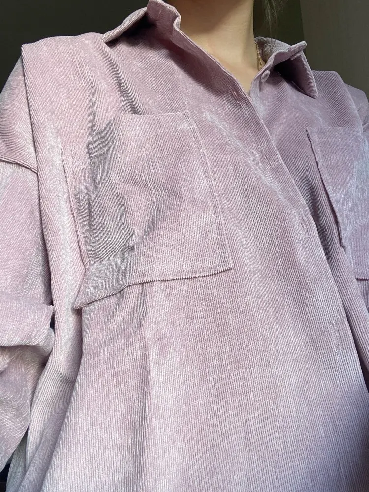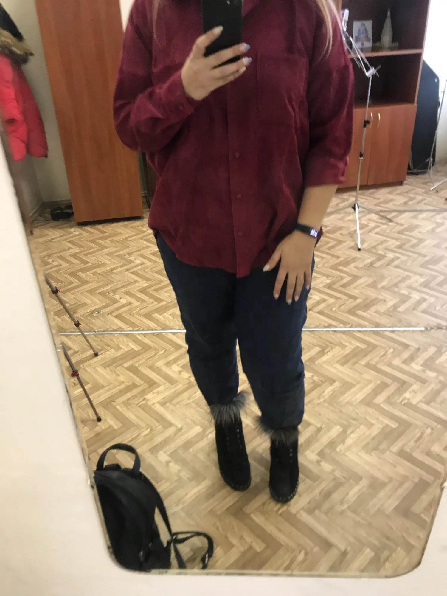 Доставка быстрая, в Екатеринбург за 2 недели. Рубашка оверсайз, как я хотела, только рукава какие-то короткие и узкие в манжете, для девушек с полными руками может не подойти, а высоким точно будут короткие. Материал рубашки под вельвет, но не такой плотный и тяжелый, похоже на материал для мягких игрушек. Карманы пришиты ровно, симметрично вроде. Кое-где торчат нитки, но не критично. С изнаночной стороны ткань какая-то неоднородная - будто в катышках, но наощупь гладкая. Еще странно, что части рубашки, где пуговицы и дырочки для пуговиц, не прошиты, просто сложены. В целом рубашка нормальная, буду носить. Мои параметры: 90-65-93, рост 161