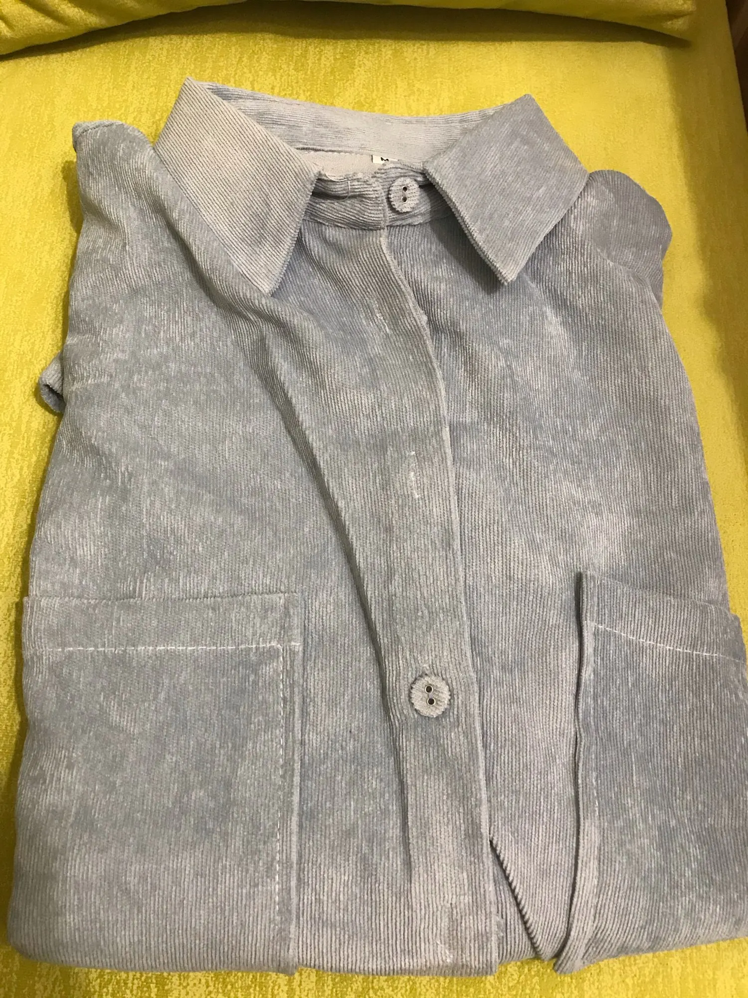 Отправили не сразу, но доставка быстрая на почту. брала L на обхват груди 114, рост 170. Все подошло. Рукава коротковаты и узкие, линия плеча спущена. Впереди рубашка закрывает пах, хотелось бы чуть подлиннее, а сзади длинная, полукругом. Ткань тонкий вельвет, состав указан хлопок и немного синтетики, но хлопка не особо чувствуется. на футболку хорошо. Рубашка качественная, пошив заводской, пакет зип фирменный, бирки у меня не было. Нитки не торчат, изнанка гладкая, запах отсутствует. Качественно и аккуратно сделана. Цвет дымчато голубой, красивый. Постирала сразу в машинке, все отлично. рекомендую к покупке.