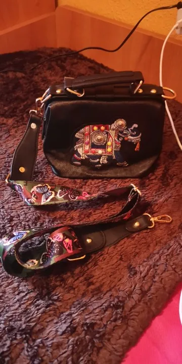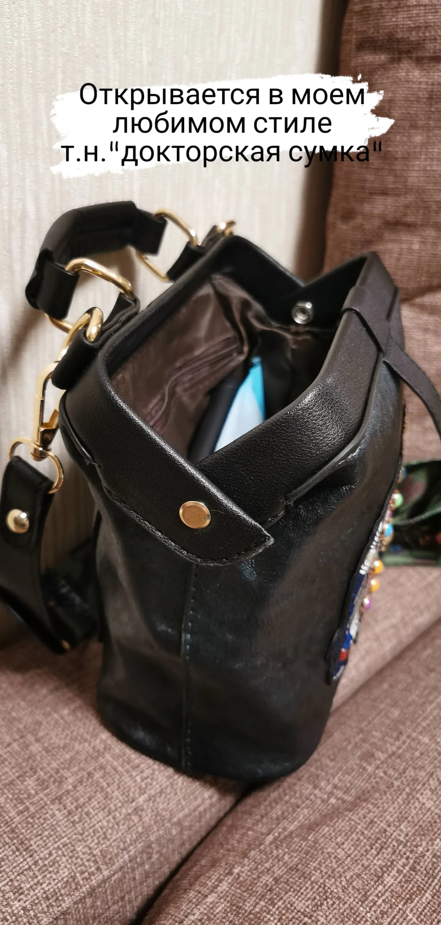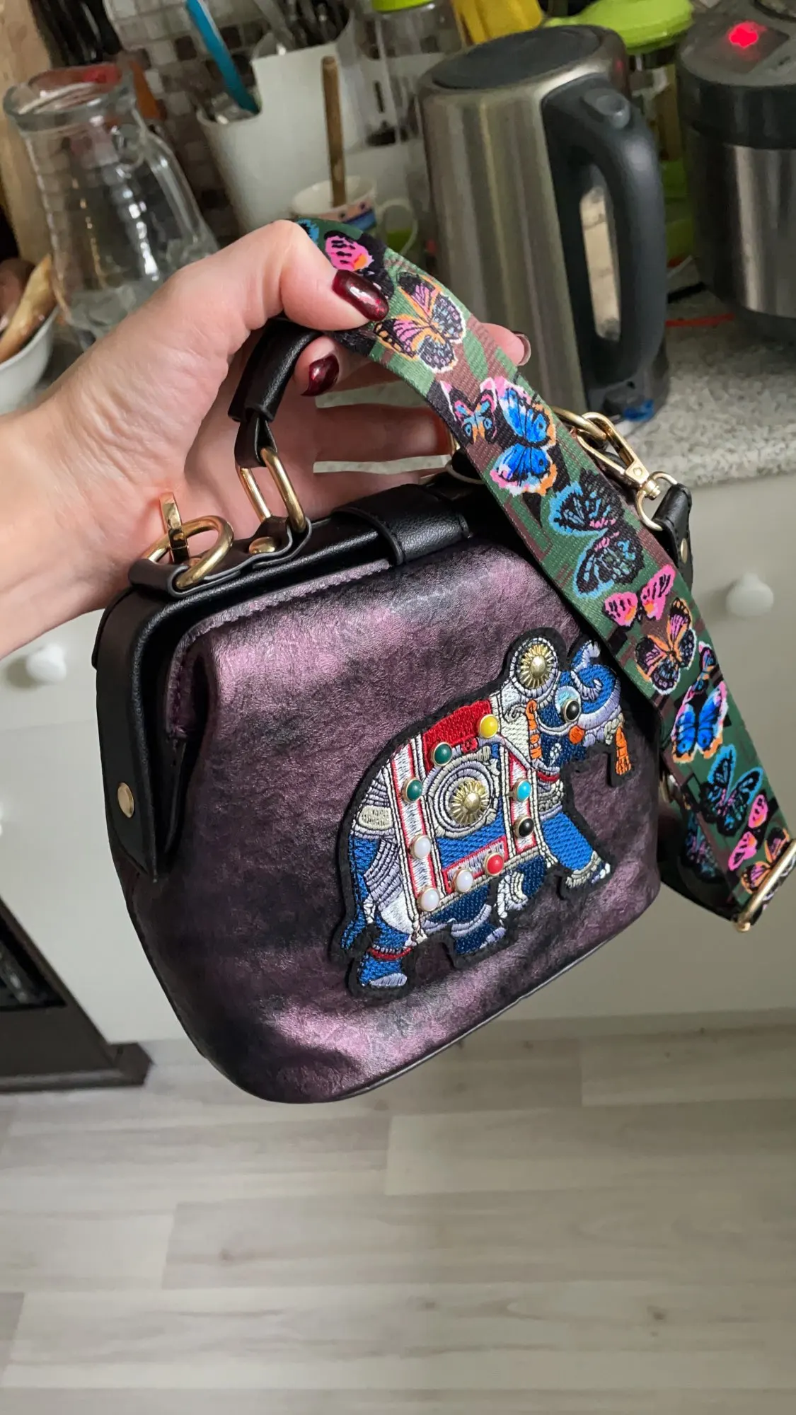 сумочка маленькая, видно, что кожзам, но оригинальная за счёт аппликации и...абалденный длинный ремешок с бабочками. под бохо идеально. в комплекте болоневая повязка для сна на глаза и колечек. без надобности, но комплимент))))) так что сумка не выходная, но стильная для минимума