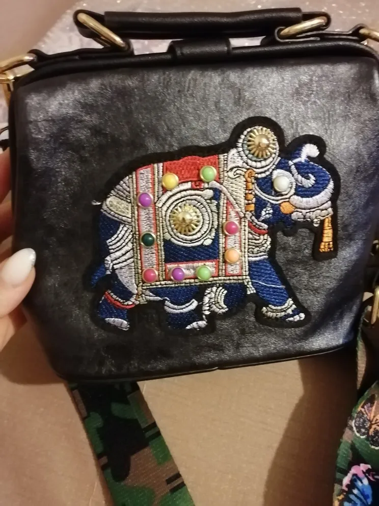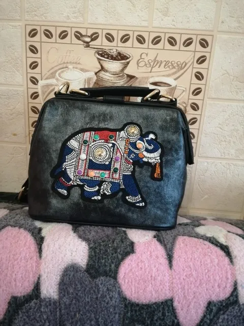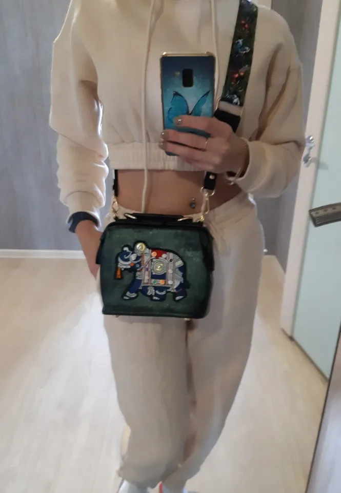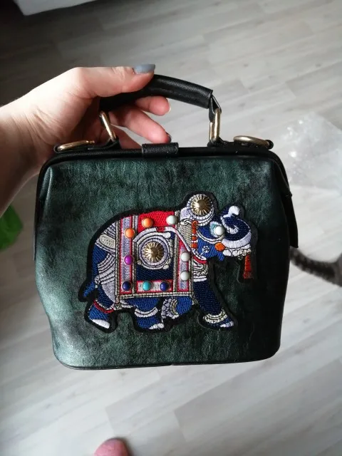 Доставка и отправка быстрые, буквально месяц, даже меньше. Сумкой очень довольна, цвет потрясающий как и сам слон. Однако очень интересная система открывания: заклёпка сзади на обратной стороне сумки, нужно чуть чуть раздвинуть и она открывается вот так как на фото. Надеюсь удобно будет пользоваться, в деле конечно посмотрим. Для меня она вместительная, телефон, кошелек и салфетки влезают, все что нужно. Советую и не жалею, покупкой довольна
