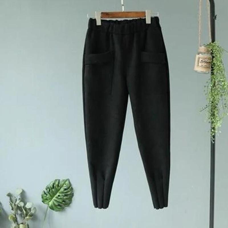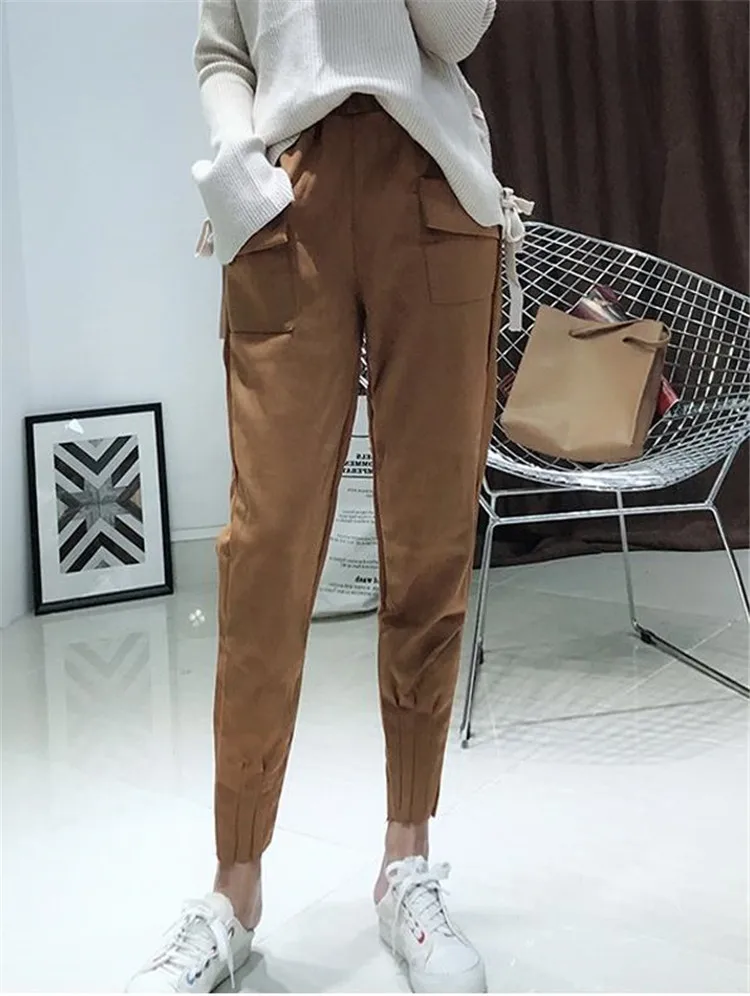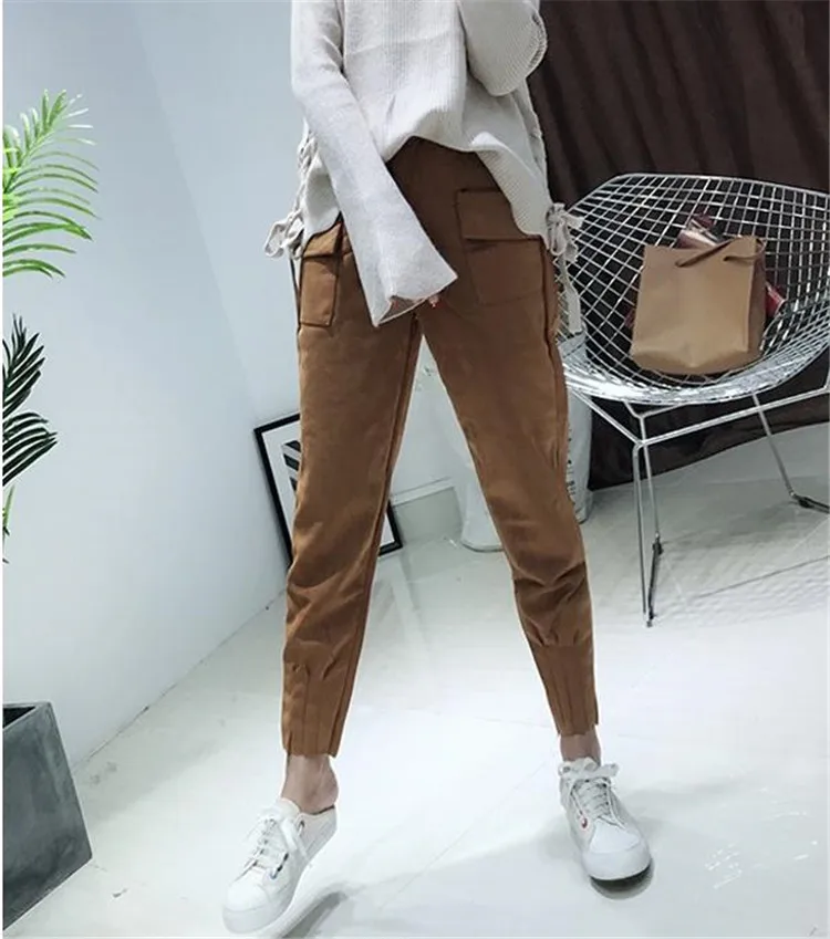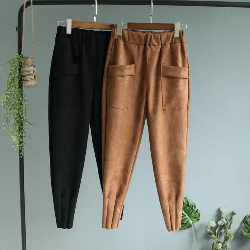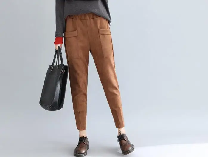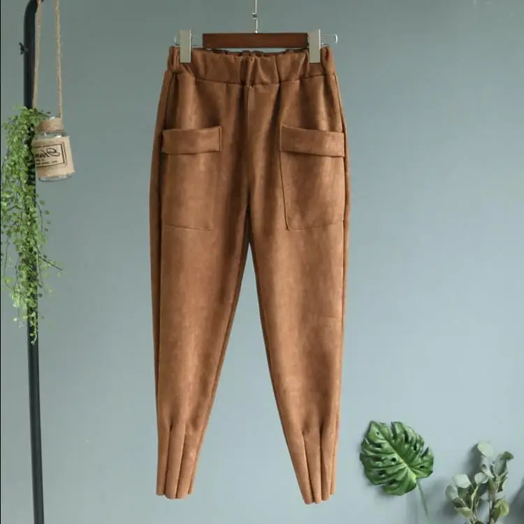 Штаны женские замшевые однотонные, с карманами, на резинке, весна-осень, размера плюс