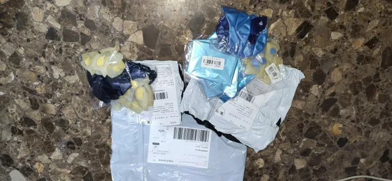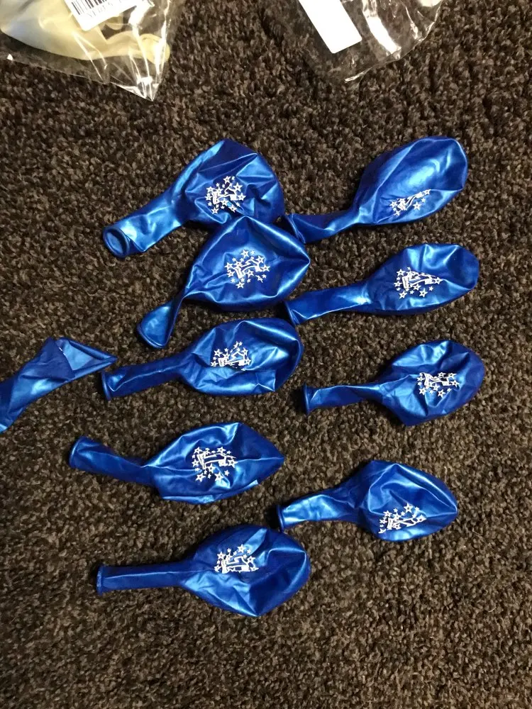приехали упакованы отдельно,всё как на картинке. 5 прозрачных с фантиками и 10 синих с цифрой. доставка около месяца. запах жуткий,рещинф или чего-то такого. поставила на подоконник у открытого окна проверяться,вроде проходит. для проверки надула только один шарик, день рождения только в январе, был целый,надеюсь остальные тоже