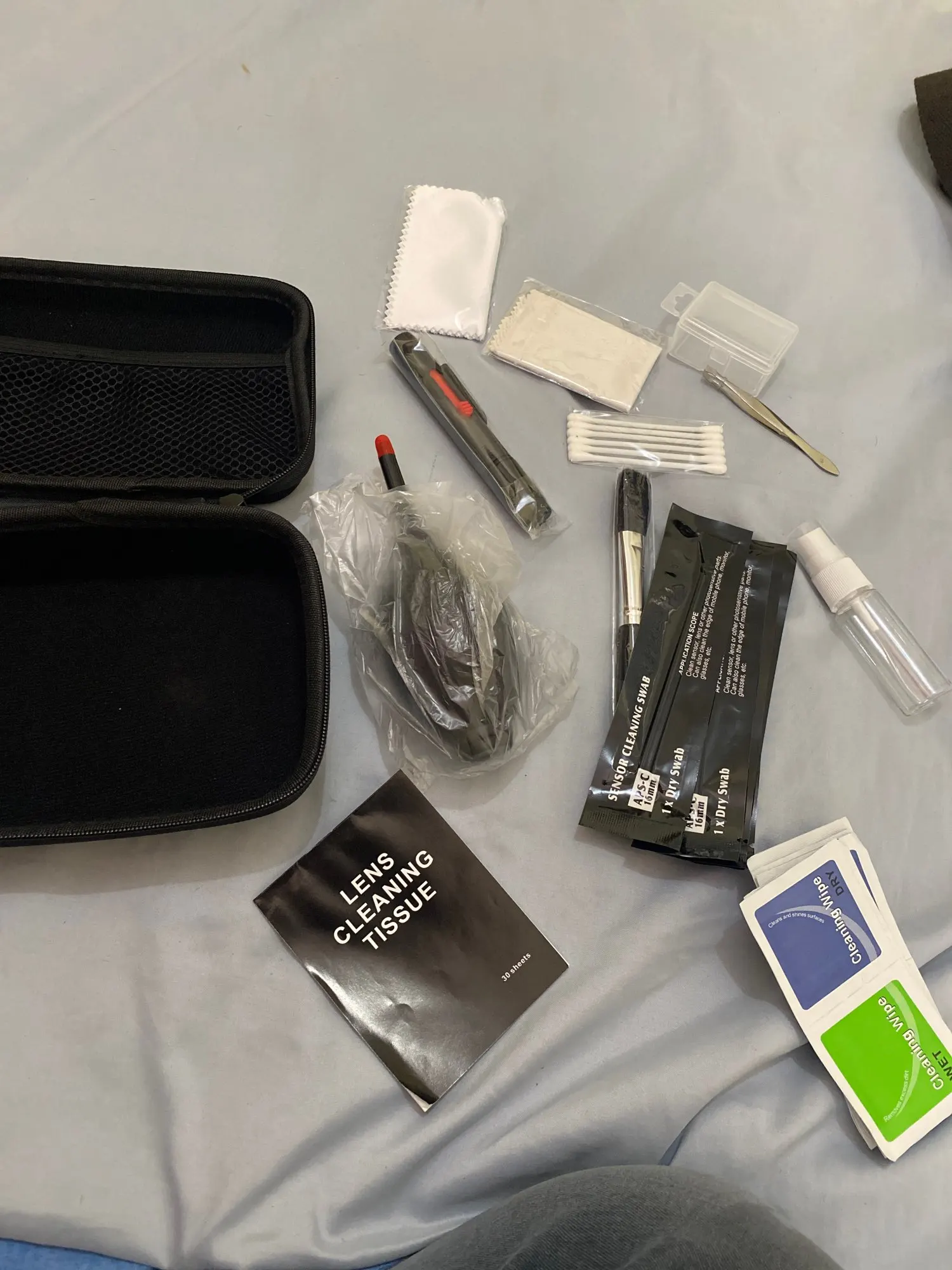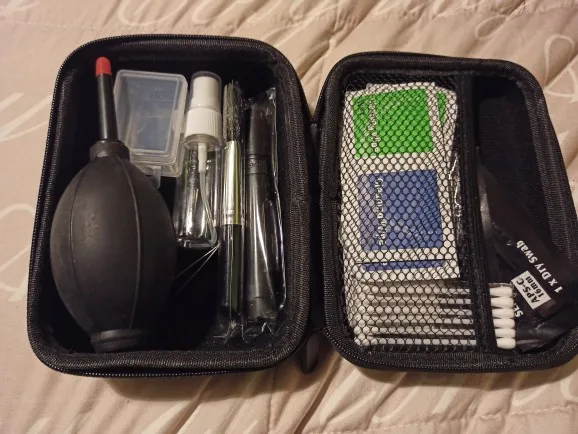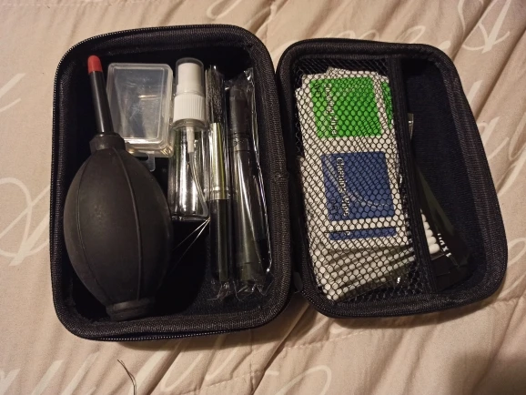 Чехол хороший, твёрдый, внутри ничего не испортится, груша дует хорошо, наконечник резиновый. кисточка в карандаше сыпется, карандаш не чистит а оставляет след, салфетки не пробовал, швабры тоже не открывал, пузырёк как и написано в описании пустой. Мой вывод: я купил очень хороший чехол, хорошую грушу, кисточка отдельная вроде нормальная, фибр тряпочки, а теперь можно покупать всё остальное и комплектовать чехол.