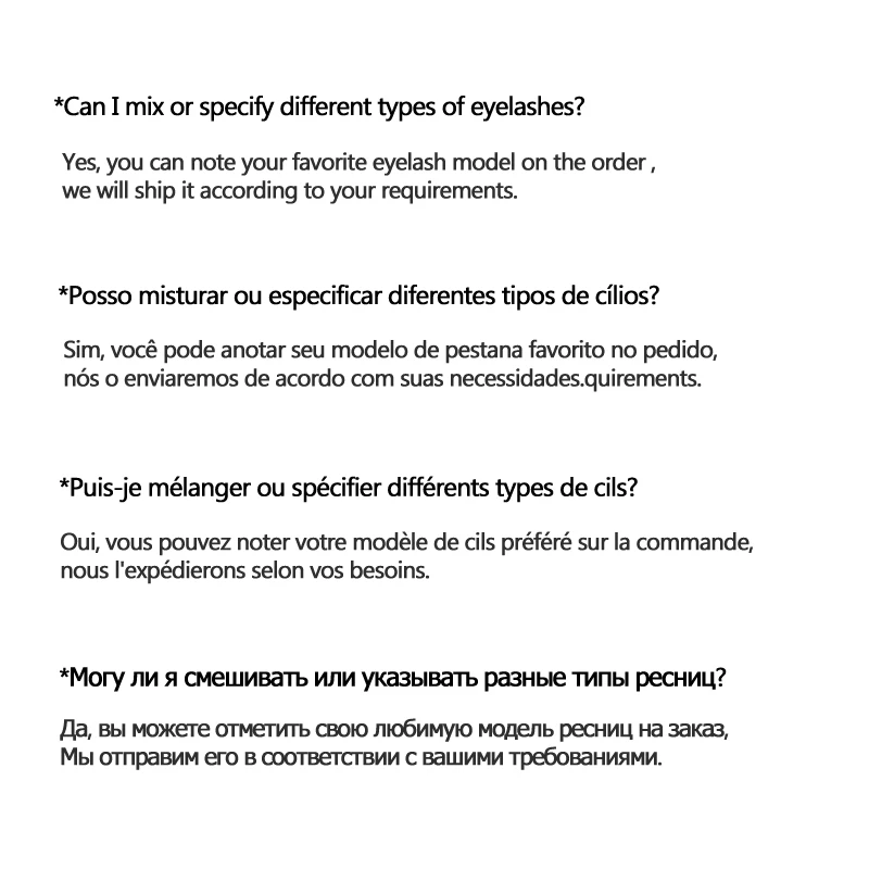 * Ресницы смешиваются случайным образом (состояние или свяжитесь с нами для особых случаев).-Пожалуйста, пришлите нам логотип, если вы выбираете партию с логотипом.