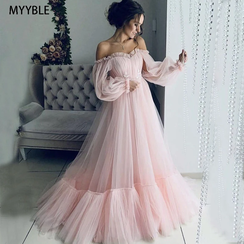 MYYBLE нежно-розовый тюль вечернее платье 2020 ТРАПЕЦИЕВИДНОЕ с длинными рукавами и вырезом сердечком длинное вечернее платье для беременных женщин
