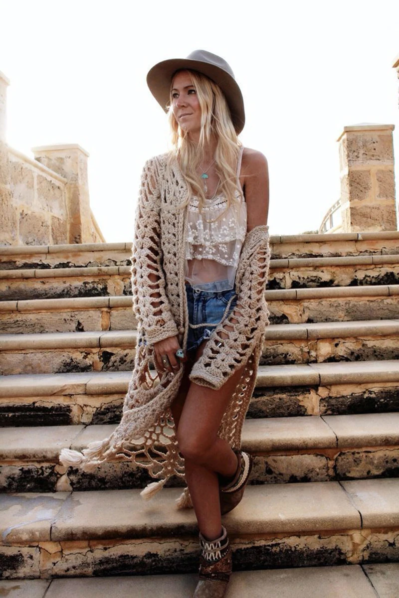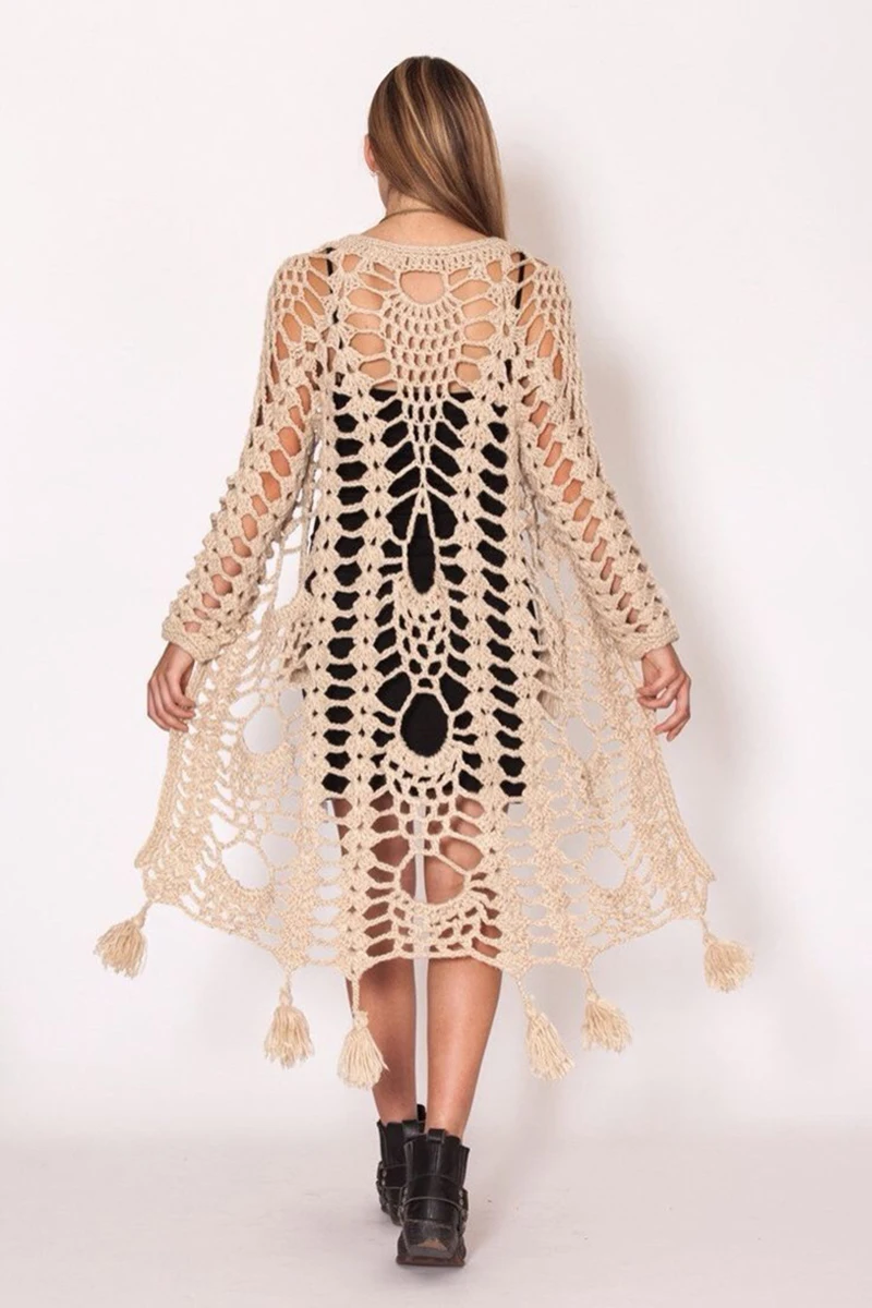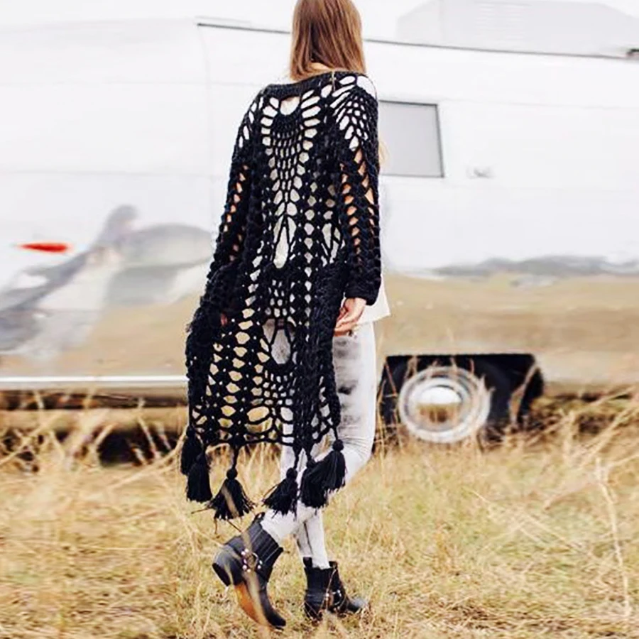 TEELYNN кружевные ажурные женские кардиганы свитер в стиле бохо с длинным рукавом связанный вручную свитер пляжная одежда кисточки зимние свитера верхняя одежда