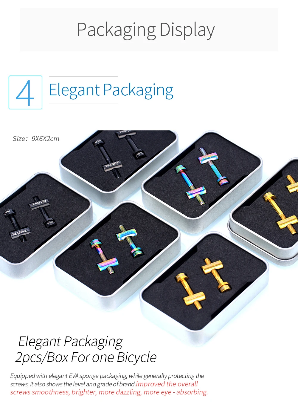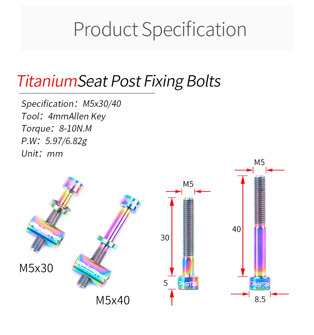 Характеристики продукта:Характеристики: M5x30/40Инструмент: 4 мм шестигранный ключКрутящий момент: 8-10N.MЦвет: титан, золотой, Радужный, черныйМатериал: титановый сплав TC4Чистая Вес: M5 * 30: 5,97 г/компл.; M5 * стандартный контейнер 40gp: 6,82 г/компл.Посылка: 2 шт. болты подседельного штыряОсобенности продукта:1. Посылка включает в себя: крепежные болты для сиденья * 2 комплекта (включая 2 болта, 2 гайки и 2 шайбы, только). Примечание: другие элементы на дисплее не включены.2. Премиум-Материал: изготовлен из титанового сплава TC4, легкий, но прочный, устойчивый к истиранию и коррозии, изготовлен до конца!3. Вакуумное покрытие: физическое осаждение паров, используемое для покрытия нитрида на этих винтах для жесткой, глянцевой, надежной и более прочной отделки4. Профессиональный дизайн: CNC Обработанные болты с высокой точностью для отделки без заусенцев и стандартных нитей5. Идеальные болты для сидений для шоссейных гонок/MTB/BMX фанатов и DIY энтузиастов: Этот сверхлегкий титановый болт разработан, чтобы помочь профессиональным велосипедистам достичь более быстрой и лучшей езды!