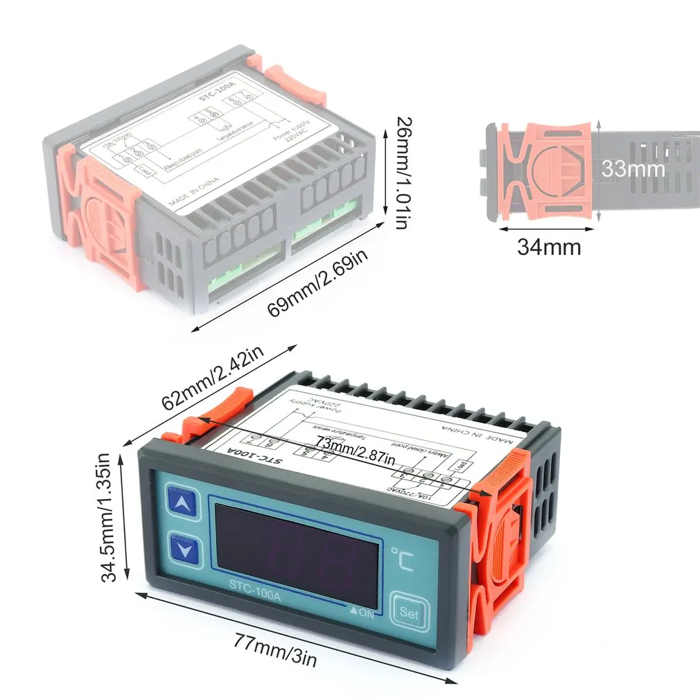 Технические характеристики:Модель: STC-100AЦвет: серыйИсточник питания: 12 В/110 В/220 В (опционально)Релейная Емкость: 10AДиапазон измерения температуры:-40 ~ 99 °CРазрешение: 1 °CТочность: ± 1 ° (-50 ~ 70 °C)Вход: 1 датчик NTCТребования к окружающей среде: температура: 0-60 °C Влажность: 20%-85% (без конденсата)Потребляемая мощность: ≤3 ВтДлина датчика: 2 м (включая зонд)Размер передней панели: 77x34,5 мм/3x1. 35 дюймовРазмер крепления: 69x26 мм/2.69x1.01inРазмер изделия: 77x34,5x62 мм/3x1. 35x2. 42 дюймаВес изделия: 146 г/5,11 унций
