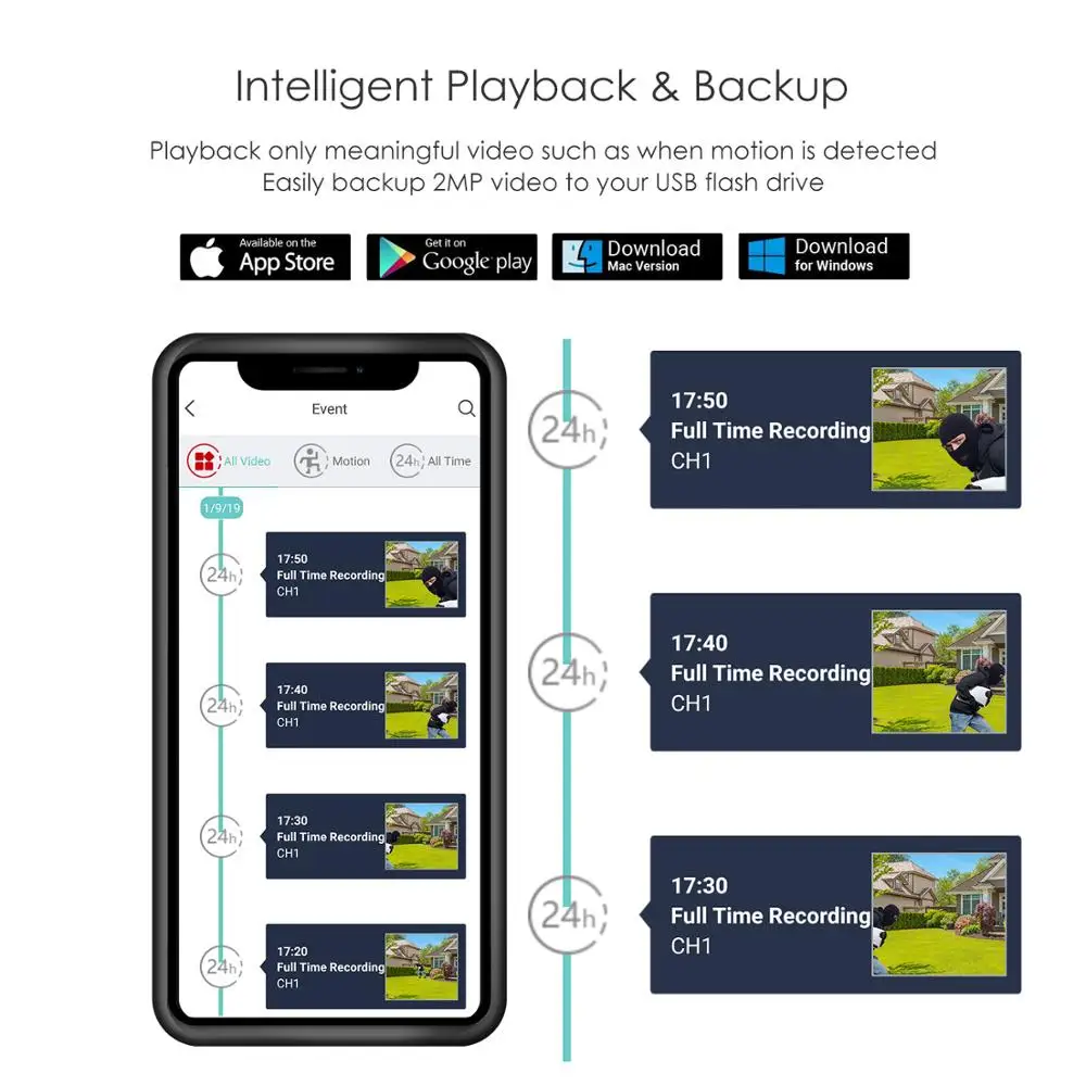 Система безопасности камеры 5 Мп позволяет выбрать любую камеру для полноэкранного воспроизведения видео в формате super HD. Вы также можете искать кадры на основе определенных событий, таких как обнаружение движения, PIR и датчик.