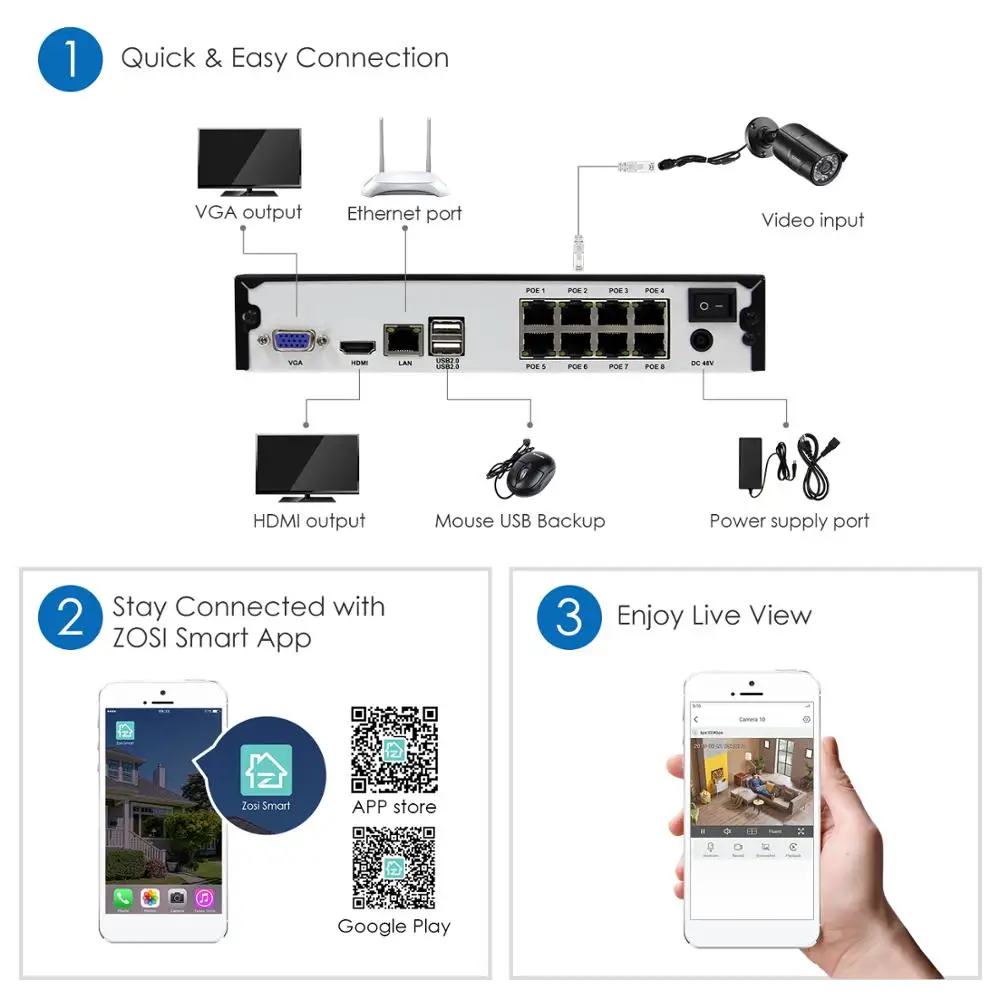С помощью только одного кабеля ethernet, соединяющего каждую ip-камеру с NVR для передачи питания и видео, система безопасности PoE (power over Ethernet) позволяет вам создать положение камеры в любом месте. Нет необходимости в отдельном адаптере питания для каждой камеры, действительно освобождая вас от грязных и утомительных кабелей.