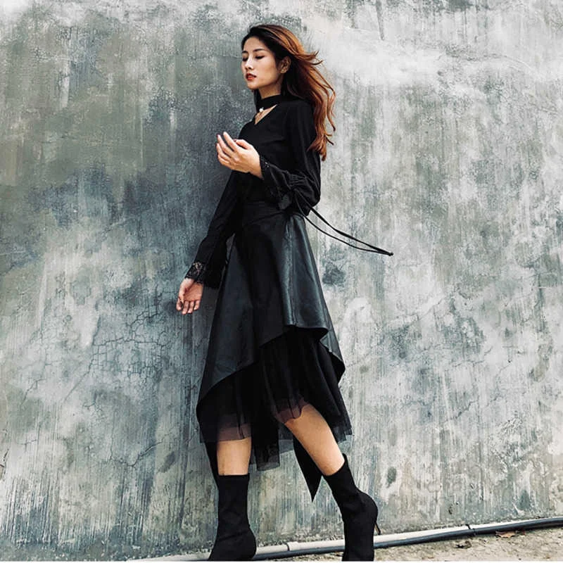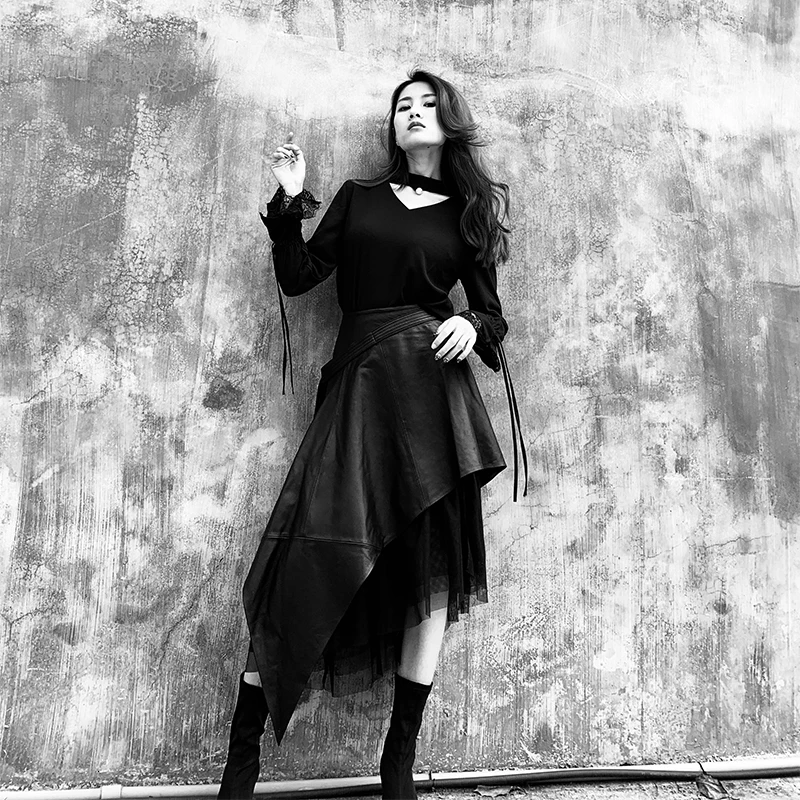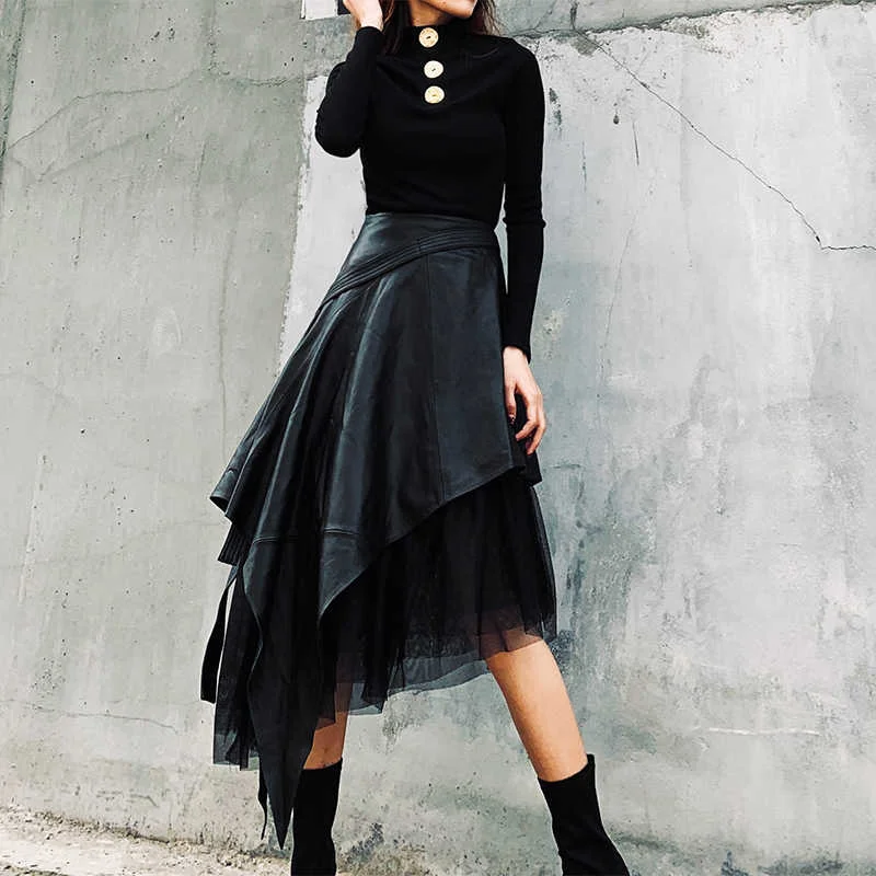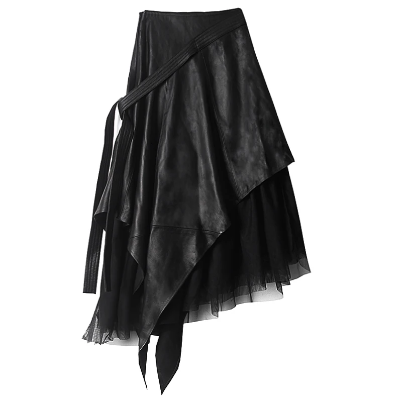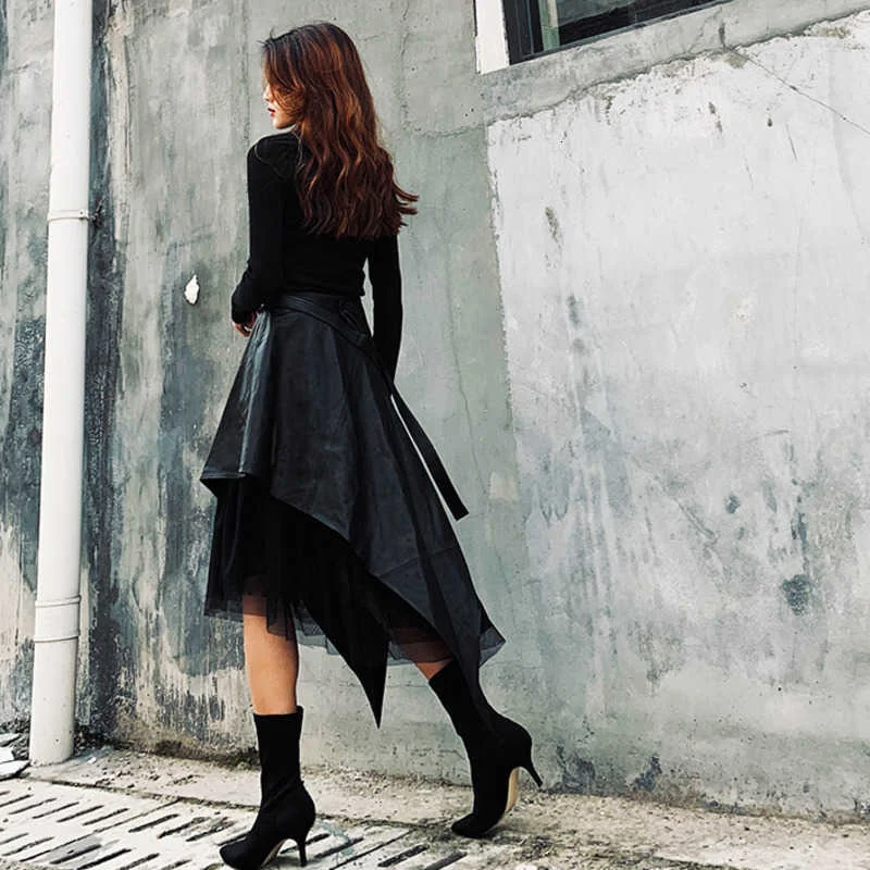 LANMREMНовинка 2022 года; Сезон весна-осень; Юбка из искусственной кожи; Длинная юбка трапециевидной формы с завышенной талией; Юбка из сетчатой ткани; 19B-a444