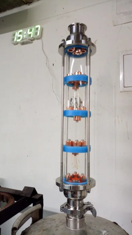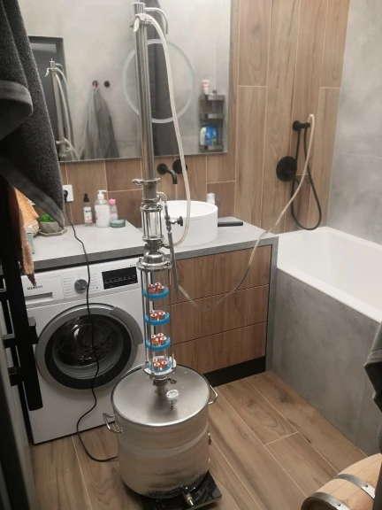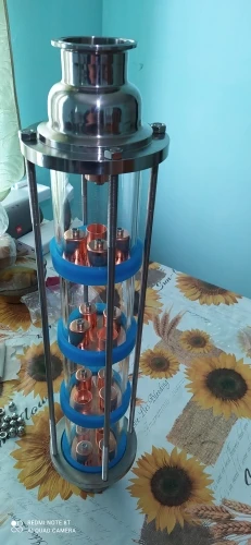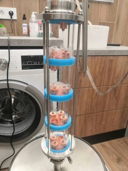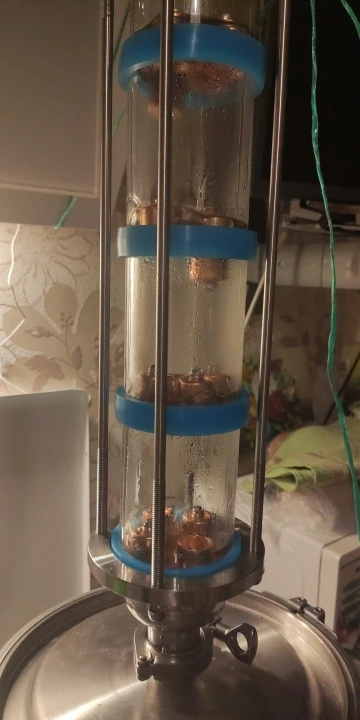 Сделано очень качественно< аккуратно. Сборка прошла без мучений с отверстиями не совпадениями и так далее. На выходе второго перегона зернового дистиллята 94-95% спирта. Аромат сохраняет. Чего и добивался. Действительно по началу запотевания нижнего стекла можно судить о конце перегона. Первый этаж это примерно подъём температуры в узле отбора на 0,2-0,3 градуса. Одну доработку сделал сразу. Почему то в комплекте нет прокладок под колпачки. Я установил силиконовые кольца (фото №2). Далее при проверке на герметичность обнаружил, что не смотря на то, что полка этажа вставляется в специальный паз в синей прокладке, все равно есть пропуск жидкости по краям. И жидкость минуя колпачки потихоньку сливается вниз. Перегону это не помешало. Скорость утечки мала. Но я в дальнейшем установлю дополнительное кольцо по краям. К продавцу и изготовителю претензий нет. За такую цену это просто блеск.