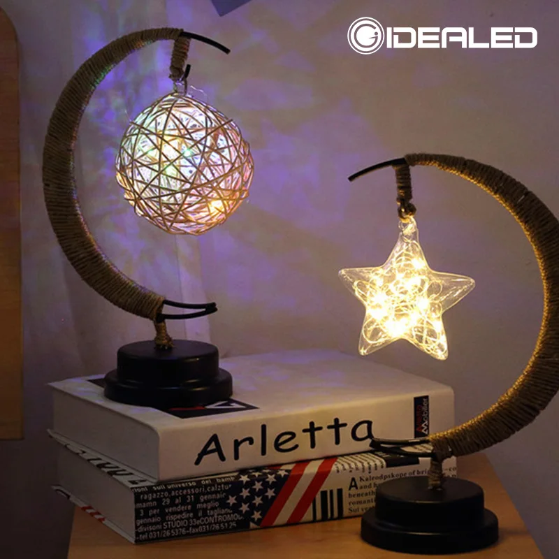Светодиодная лампа в виде звезд и Луны, ротанговый шар, рождественское освещение, детский подарок на день рождения, ручная работа, пеньковая веревка, USB, кованый железный ночник