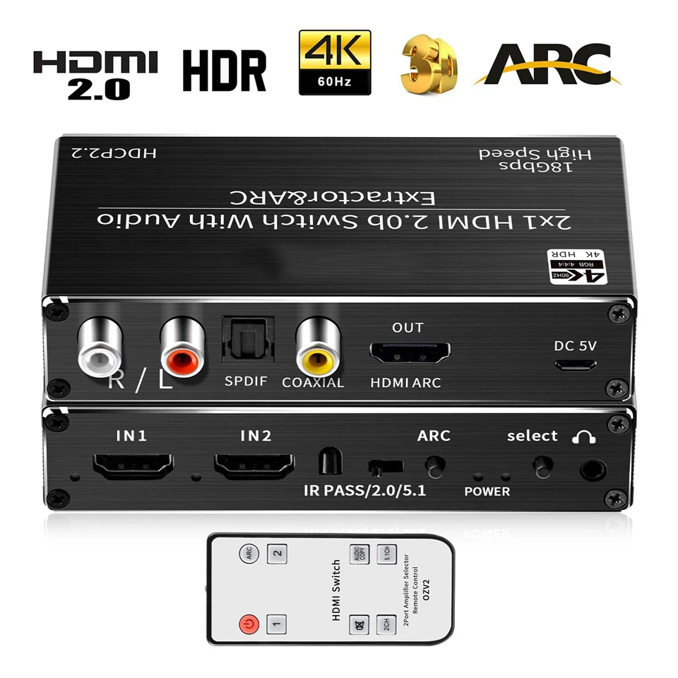 Мини 2x1 4K HDMI переключатель аудио экстрактор с дугой и оптическим Toslink HDMI 2,0 переключатель 4K 60 Гц HDMI переключатель дистанционное управление для Apple TV PS4