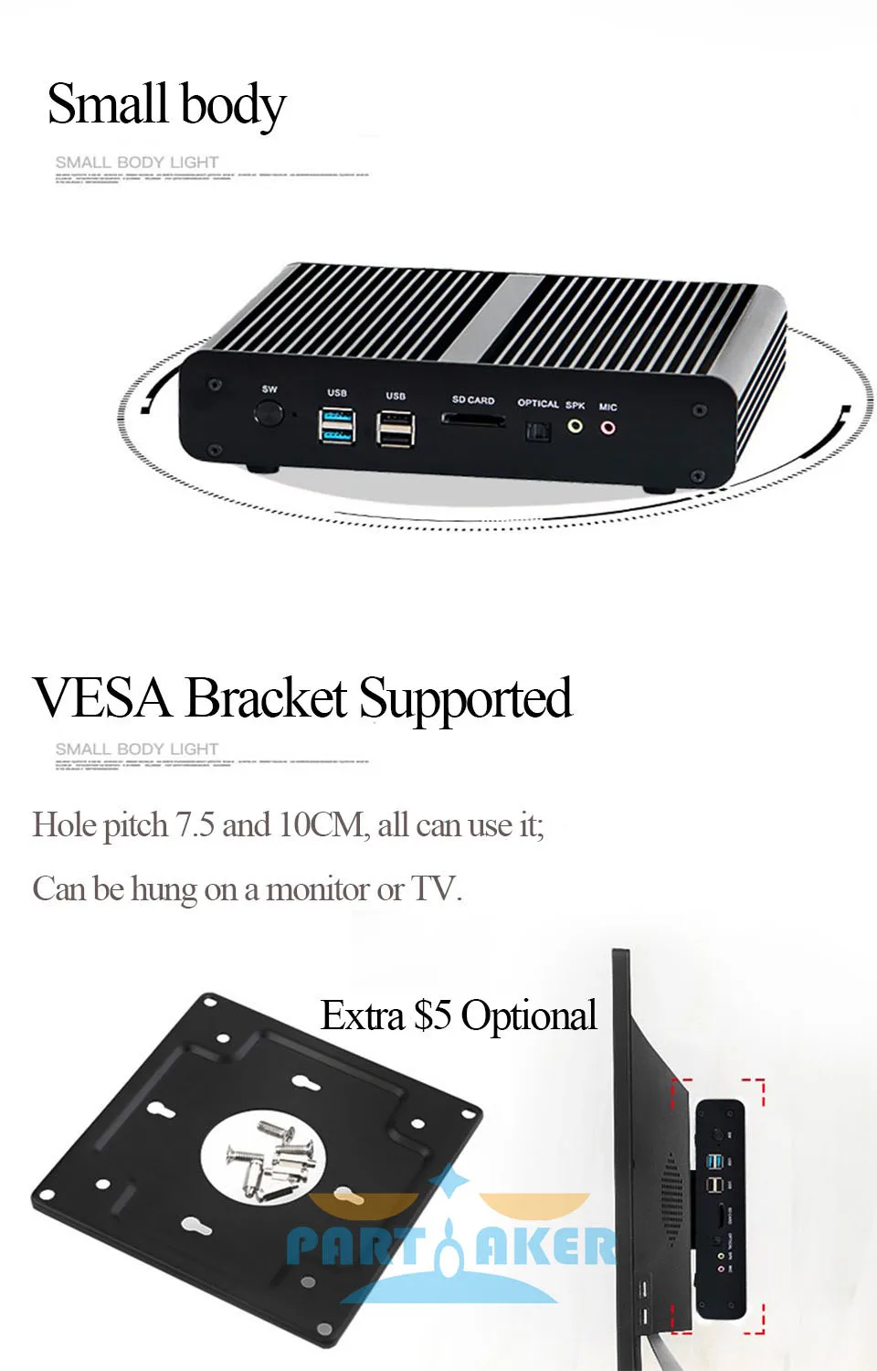 3: низкая мощность: все мини-ПК работают 12 в источник питания, потребляемая мощность составляет от 25 Вт до 35 Вт, по сравнению с 150 Вт традиционного потребления ПК, экономит более 80% энергии.