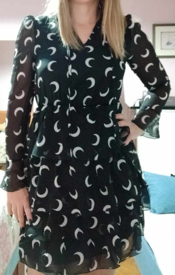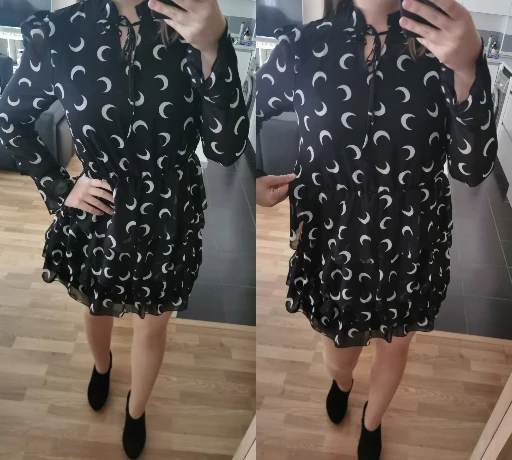 Polecam gorąco sukienka przepiękna. Wzielam rozm m i nie żałuje w sam raz, na pas 70 cm. Polecam gorąco, ładny szyfonowy materiał. Rękawki przezroczyste, wiązanie przy szyi dodaje uroku. Na wzrost 175 nie jest za krótka.