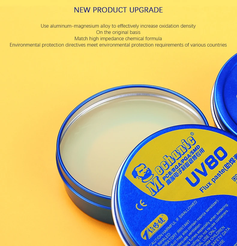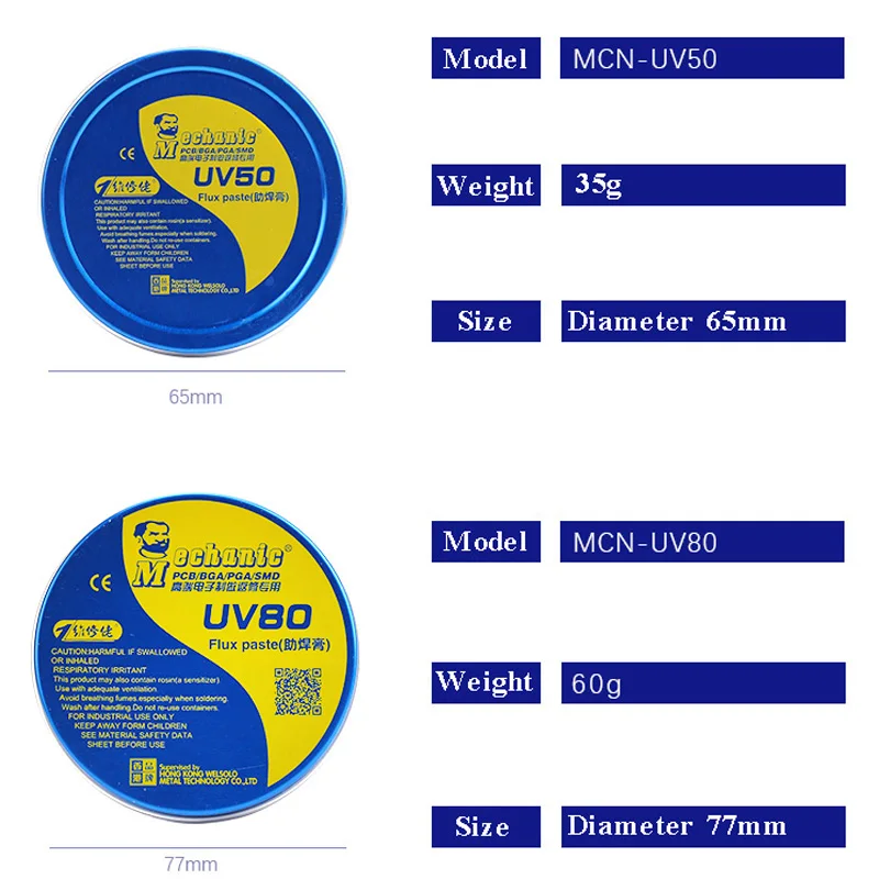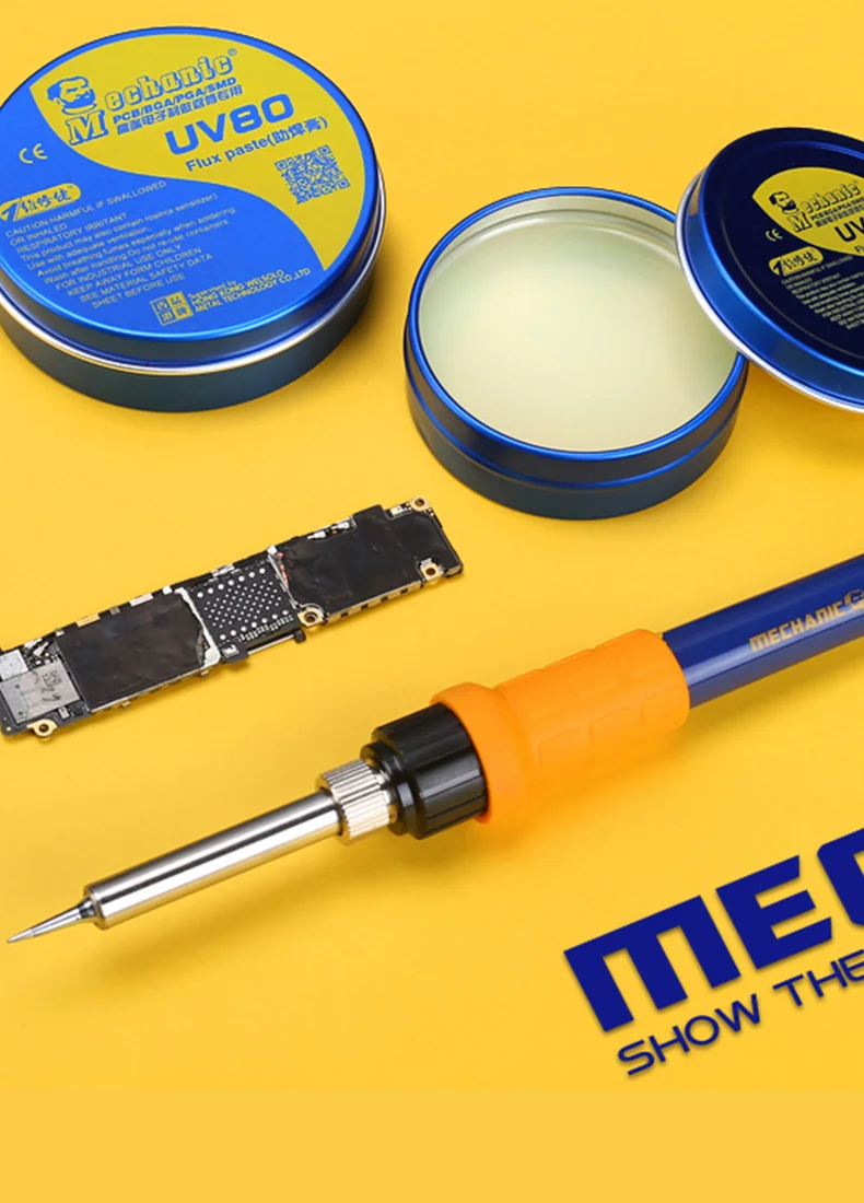 Спецификация: -- Бренд: MECHANIC -- Тип: паяльная флюсовая паста Особенности: -- Отличный паяльный рабочий инструмент для ремонта смартфонов, печатных плат, BGA, электронных деталей. -Мягкий рН, отсутствие коррозии к IC или PCB. -Прозрачный остаток, стирка не требуется. -Температура плавления немного выше, чем паяльник Посылка: 1 * паяльная флюсовая паста