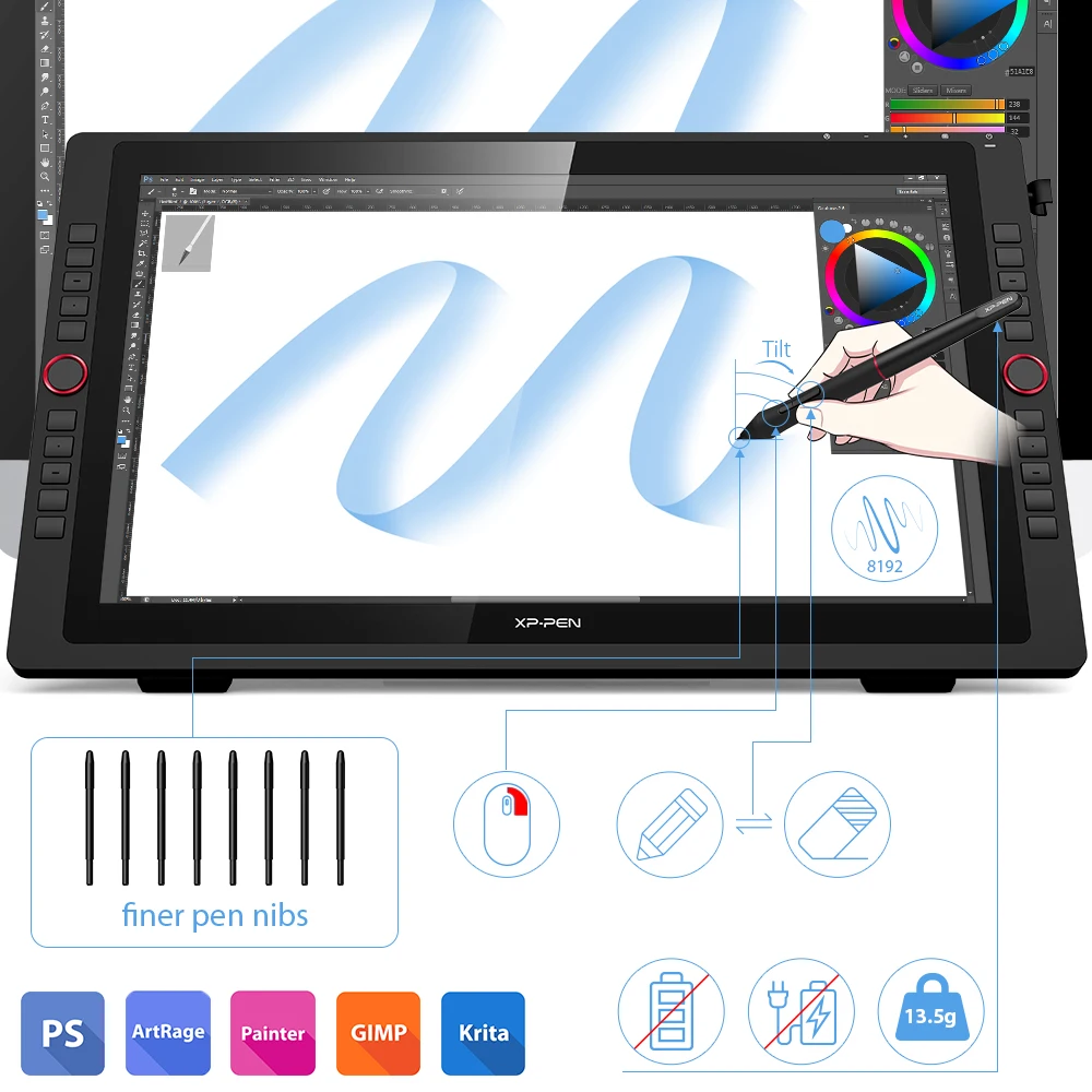 Превосходный планшет. Быстрая установка. Распознан сразу на Windows 10. Кажется качество. Экран очень приятный на цветопередаче и разрешении. Поставляется с дополнительной перчаткой и стилусом. Только нижняя сторона: несмотря на 8192 уровней давления наконечника стилуса, мы не достигаем качества Wacom. Например, если вы просто дадите авторучке скользить по экрану без нажатия, он не будет писать. Все еще необходимо тренировать небольшое нажатие, чтобы увидеть черту (в отличие от моего Wacom 13HD). Кроме того, настройки уровней давления стилуса непонятны в интерфейсе программного обеспечения конфигурации. Переключение нескольких миллиметров между позицией пера и указателем экрана, но Исправлено после калибровки в настройках экрана (не объяснено в doc). Последние также не имеют более подробных объяснений. Быстрая доставка и хорошая упаковка (отправка из Германии).