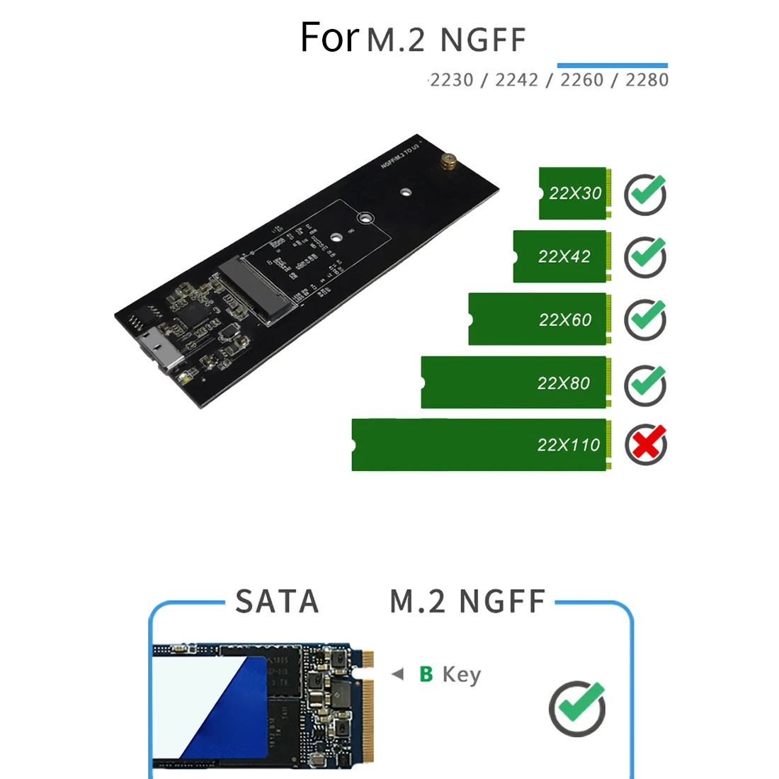M.2 NGFFТип C Спецификация корпуса:Бренд: XT-XINTEЦвет: черныйРазмер: 102*33*8 ммВес: около 80 гЕмкость поддержки: 2 ТБСкорость передачи: 6 Гбит/сПоддержка жесткого диска: SATA протокол M.2 B Ключ NGFF твердотельный диск (2242/2260/2280)Входной интерфейс: интерфейс USB3.1 Type-cМатериал: алюминиевый сплавОсобенности:M.2 NGFF для мобильного жесткого диска Type-C USB3.1Металлический корпус, суперпрочная металлическая текстураОчень тонкий и разныеЛегко носить с собой, удобно и быстроБыстрое отведение тепла для защиты жесткого дискаТехническая скорость 6 Гбит/с, быстрая скоростьПоддерживает M.2 B Ключ NGFF твердотельных дисков из 2242/2260/2280 спецификации, с погрешностью в пределах 2-х ТБПоддержка горячей заменыПоддержка компьютерной системы: Mac OS,Linux,windows SE/ME/2000/XP/Vista/7/8/10Поддержка систем мобильных телефонов: большинство телефонов Android не включают в себя все модели.Полезные советы:1. Только коробки для жесткого диска, жесткие диски SSD в комплект не входят.2. Поддерживается только M.2 B Key NGFF SSD. (PCI-E M.2 NVME и PCI-E M.2 SSD на базе AHCI не поддерживаются)Поставка содержит:M.2 NGFF Тип C мобильный жесткий диск коробка * 1USB3.0 A/C кабель для передачи данных * 1Отвертка * 1Винты сумка * 1