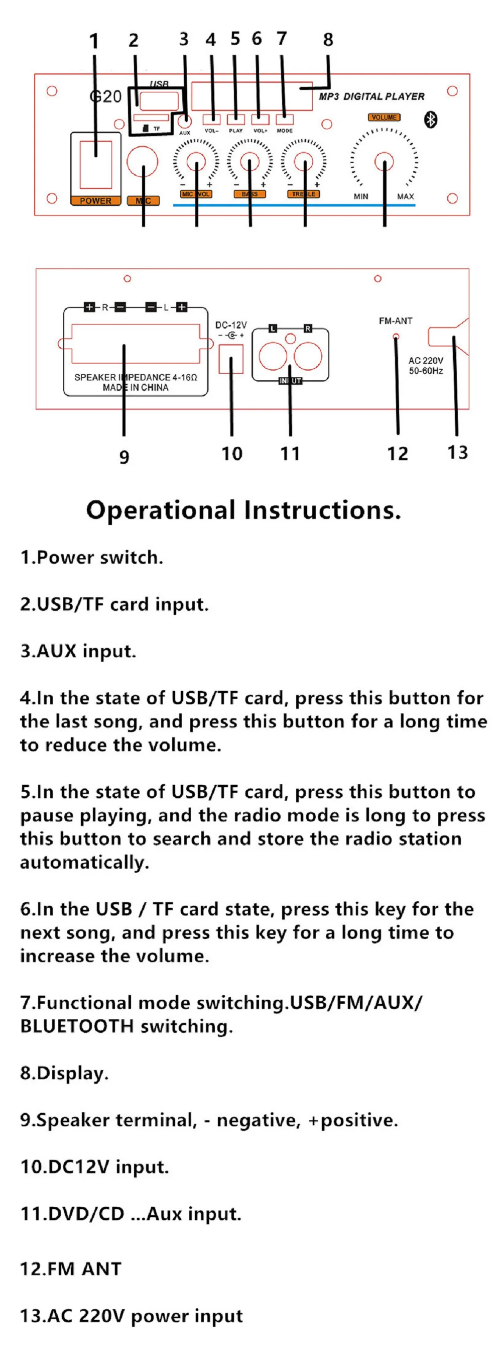 1. Беспроводная связь bluetooth, легко подключается к iphone, к ipads, смартфонам, планшетным компьютерам и другим bluetooth-устройствам, usb-интерфейсу, то есть к трансляции и использованию, и наслаждайтесь высококачественной музыкой2. Регулировка высоких частот, басов и громкости и дает вам реальный HIFI звуковой эффект3. Слот USB / SD для воспроизведения MP3 с карты памяти или карты4. Цифровой mp3-плеер5. Полнофункциональное инфракрасное управление6. Fm-радио7. С разъемом для микрофона и эффектом