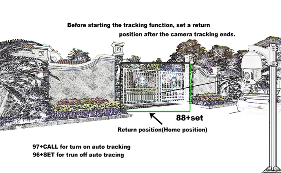 Перед включением функции отслеживания вам необходимо установить положение возврата (положение возврата) после окончания трека. Затем включите отслеживание. В чехол без отслеживания, Камера ожидает возврата, камера включается при обнаружении человека. После завершения отслеживания камера автоматически возвращается в положение возврата и продолжает ждать следующего отслеживания.