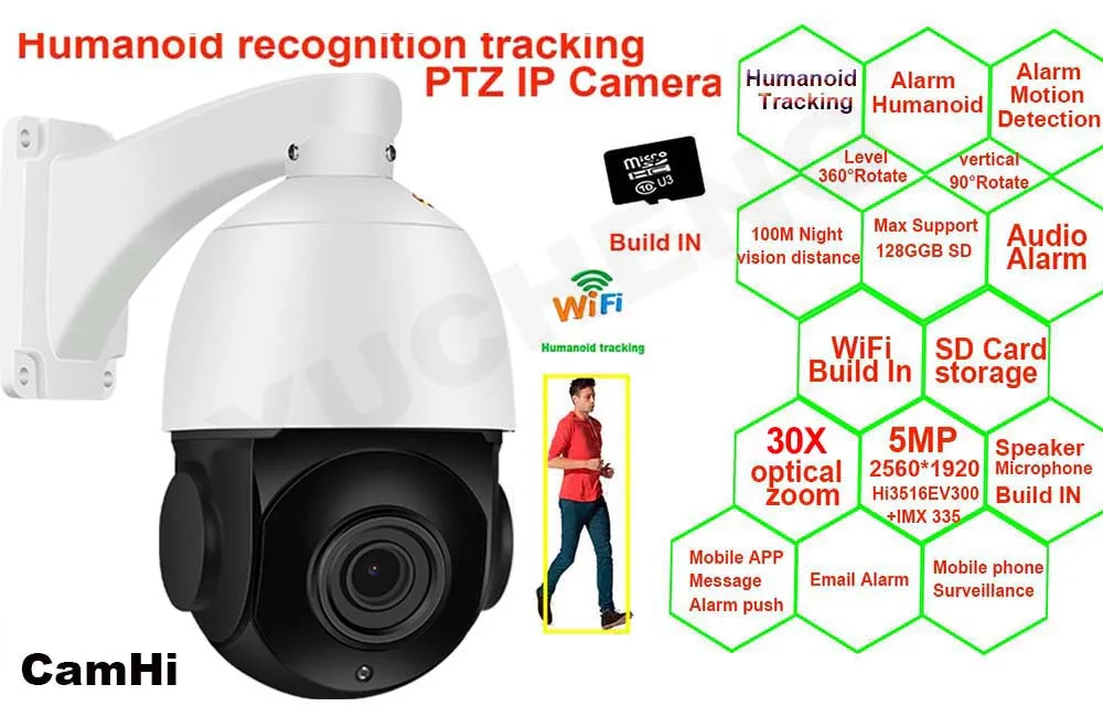 CamHi 5 Мп Беспроводная гуманоидная камера с 30-кратным зумом и автотреком, скоростная ИК PTZ IP-камера с распознаванием гуманоидов, встроенный микрофон, динамик, SD-карта 128 ГБ