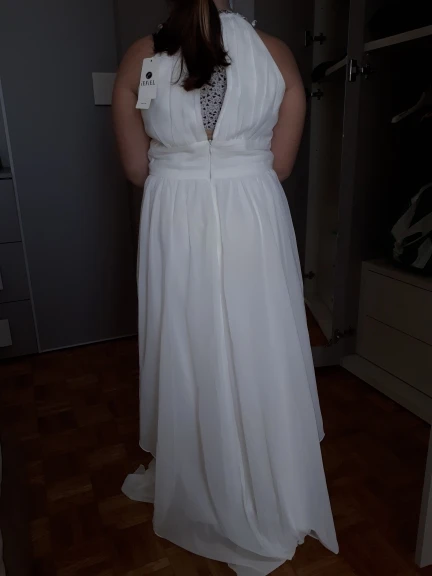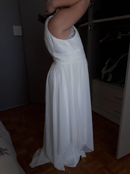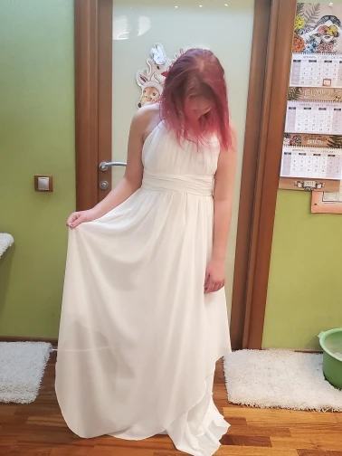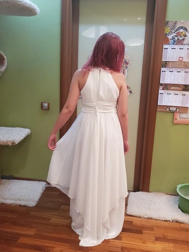 платье понравилось, пошито хорошо, нигде не тянет, не торчат нитки. Размер оказался больше заявленного в таблице, но это даже хорошо, есть небольшой запас, длинноватое, придётся подрезать. Юбка не так красиво смотрится на самом деле, но в общем за такие деньги очень хорошее платье. Заказали ещё 5 подобных платьев для группы на сцену, как придут- обновлю отзыв. Добавляю: пришло ещё 5 платьев, претензий нет, без брака, замки хорошо застегиваются, все швы аккуратные, ровные, размеры все одинаковые, нет шире или уже, ткань молочного цвета, приятная. Упакованы хорошо, почти не помялись, дошли за 2 недели до Новосибирска!
