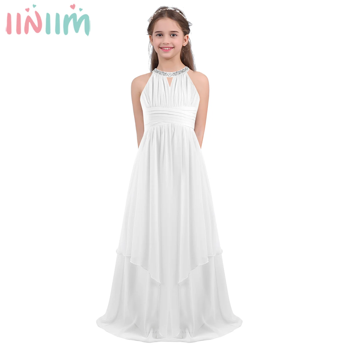 Детское платье принцессы iiniim, детское шифоновое свадебное платье для девочек с блестками, платье с лямкой на шее и цветами, платья, вечерние костюмы для подростков