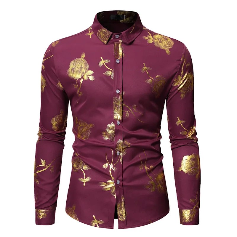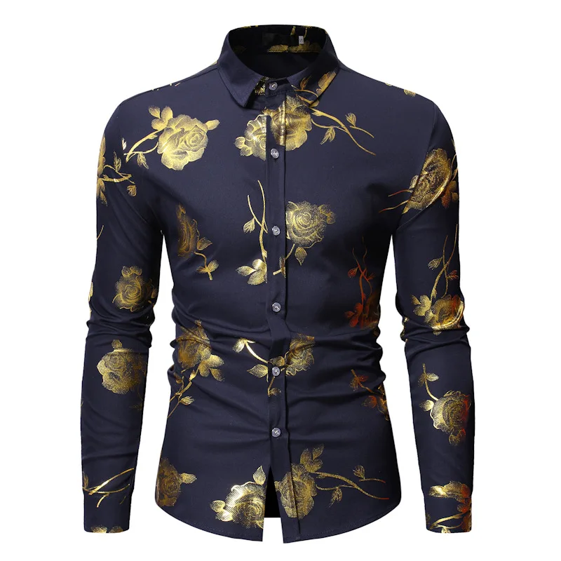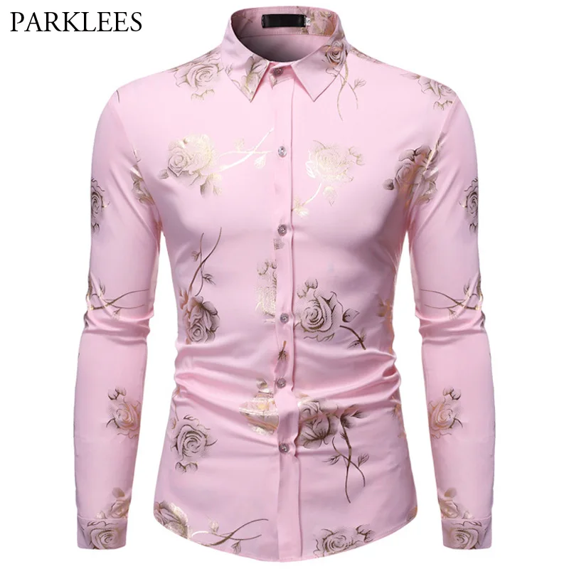 Мужская рубашка с цветочным принтом золотистой розы, фирменная Новинка, мужские рубашки в стиле стимпанк, розовые рубашки с длинным рукавом для свадебной вечеринки, бронзовая рубашка Camisa Masculina