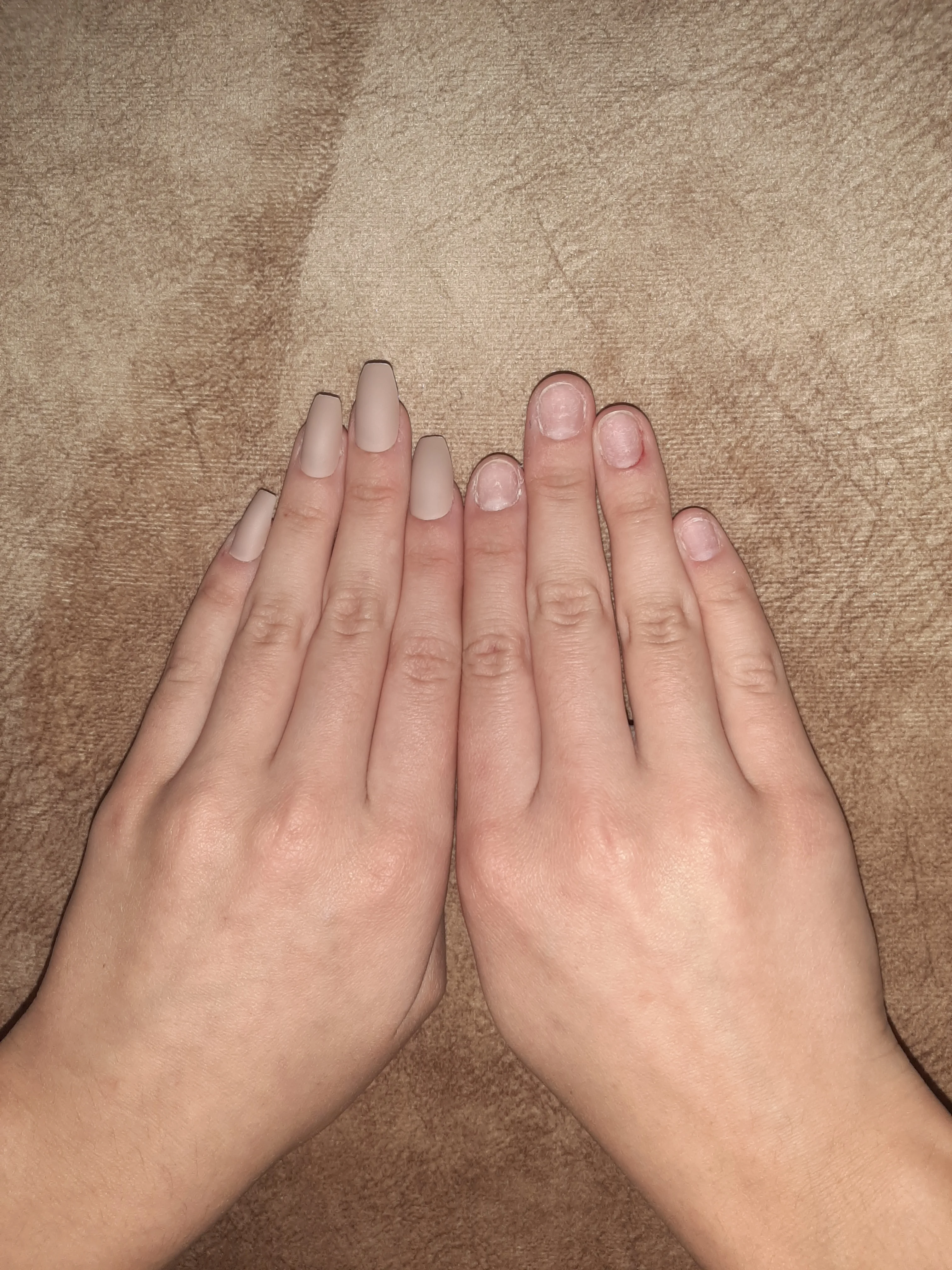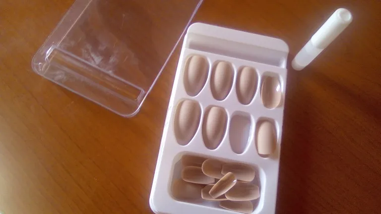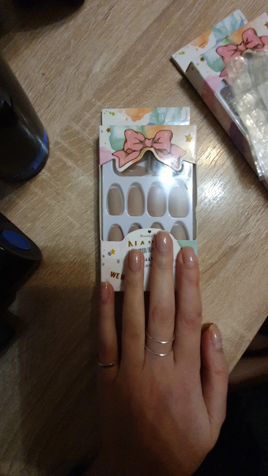 Очень красивые накладные ногти. Раньше относилась к подобному скептически, но после покупки в полном восторге. Смотрятся натурально. Клей в наборе очень хорошо скрепляет, жаль его хватит максимум на 3 раза. Я кстати изменила форму ногтей, материал очень хорошо пилится. По размеру хорошо подошло. Однозначно закажу ещё
