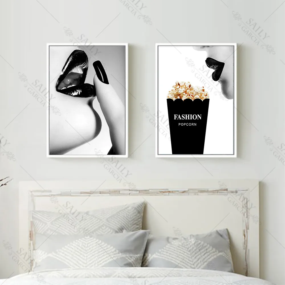 Поп-арт, холст, живопись, модный Попкорн, черно-белая женщина, принт губ, плакаты, Современный домашний декор, настенные картины для гостиной