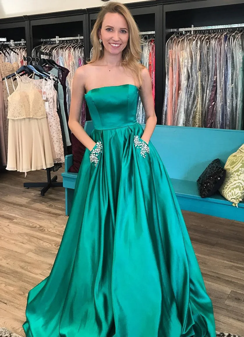 Длинные вечерние атласные платья-трапеции, без бретелек, с карманами, со стразами, со шнуровкой сзади, бальное платье для выпускного вечера, 2020