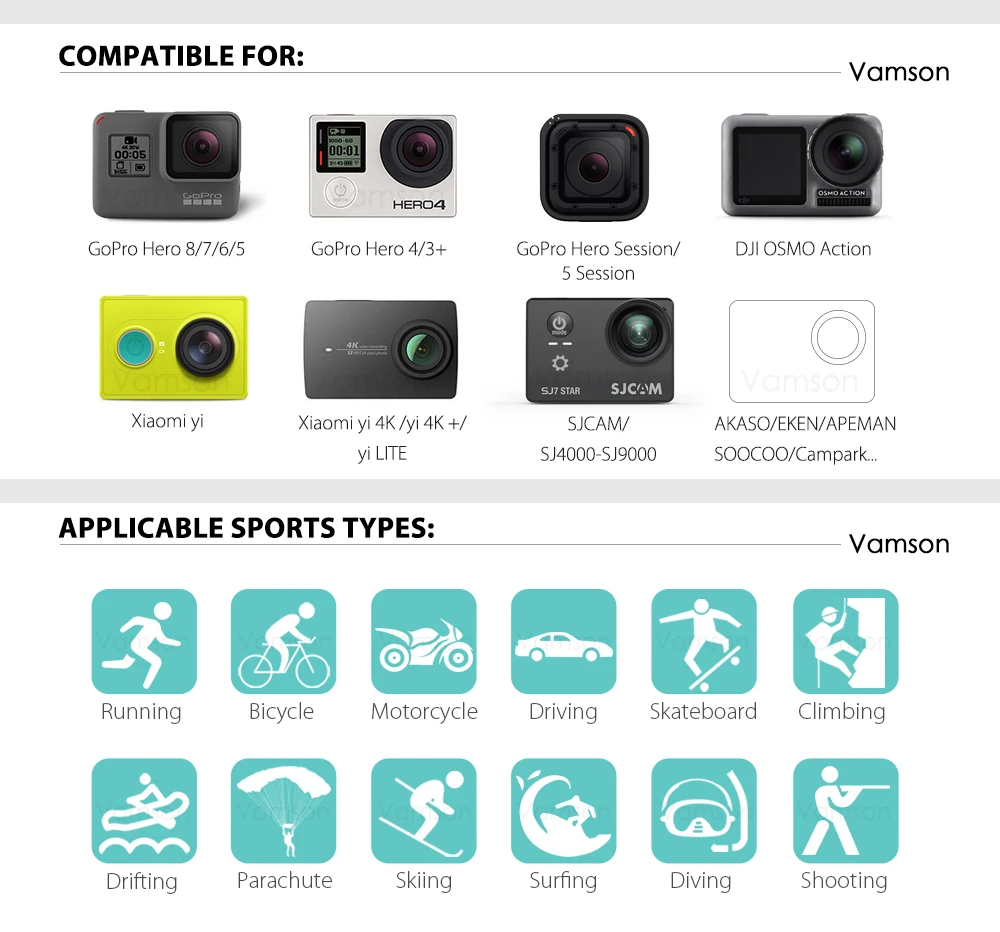 О: совместимость с gopro hero 8 Black 7 6 5 4 3 2 1 /Для Xiaomi yi 1/yi 2 /yi 4k/yi 4k +/yi lite /Для SJCAM SJ4000 SJ5000 SJ6000 SJ7000 /Для EKEN/SOOCOO/SONY и большинства экшн-камер