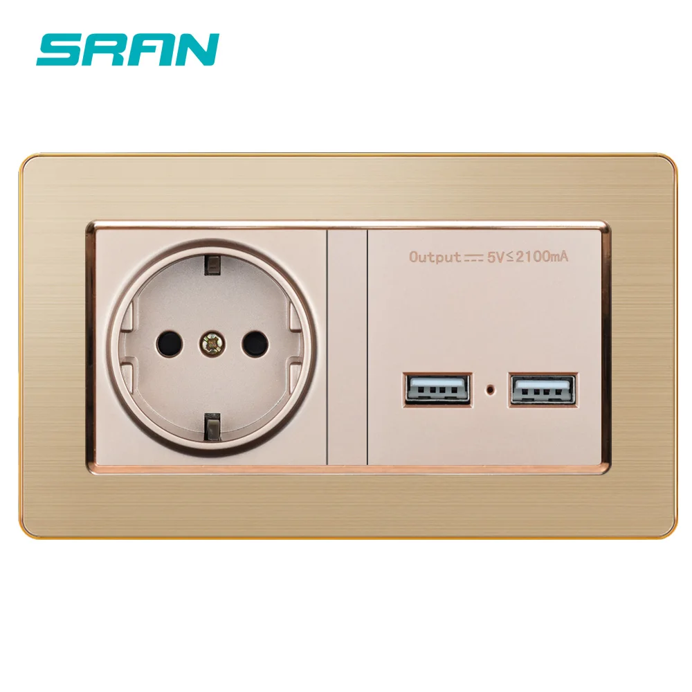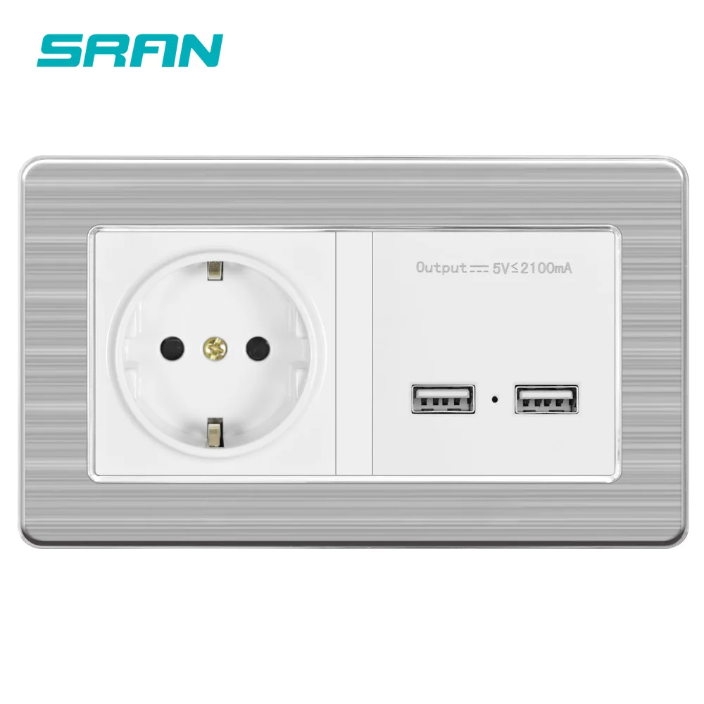Настенная розетка SRAN европейского стандарта, электрическая розетка с двойным USB умным Индукционным зарядным портом для мобильного 5 в А, панель из нержавеющей стали