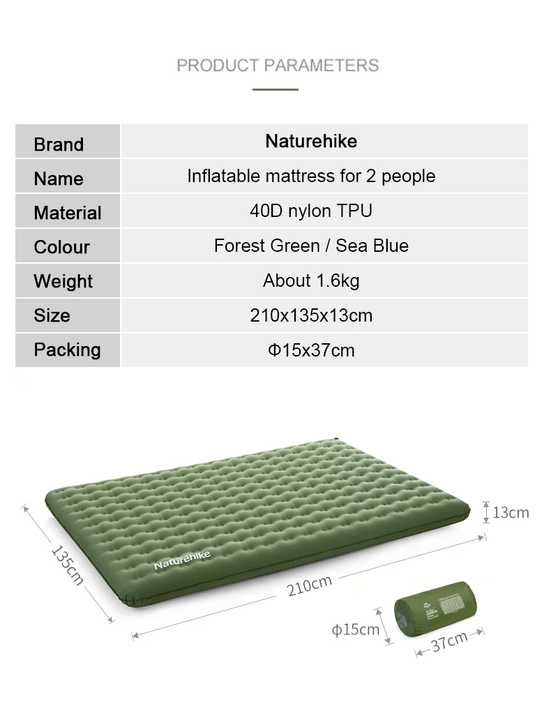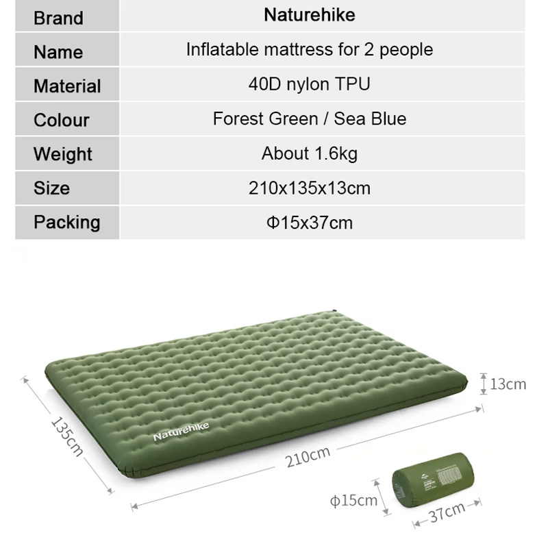 Бренд: NaturehikeНазвание товара: надувной матрас на 2 человекаМатериал: 40D нейлон ТПУЦвета: Лесной Зеленый/морской синийВес: около 1,6 кгРазмер: 210x135x13 смРазмер упаковки: ф15x37 см