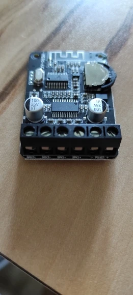 По блютуз подключается быстро, звук при подключении может быть очень громким (хорошо что не голосом). При 5В работает, но звук совсем слабоват: при 12В наиболее удачно, греется не сильно: при 24В самый качественный звук, но сильно греется, требуется радиатор. Колонки 4 Ом х 6 Вт работают, но звук плоский, низких мало.