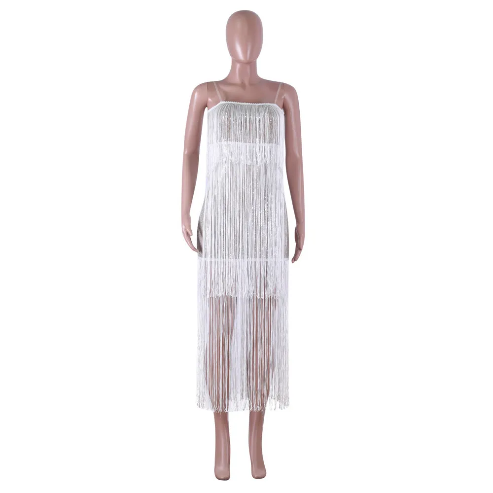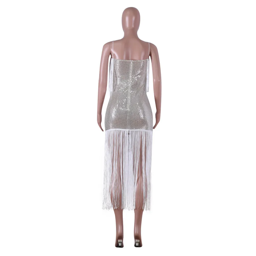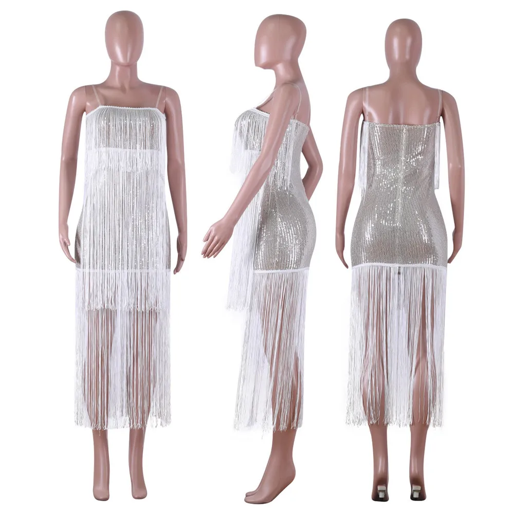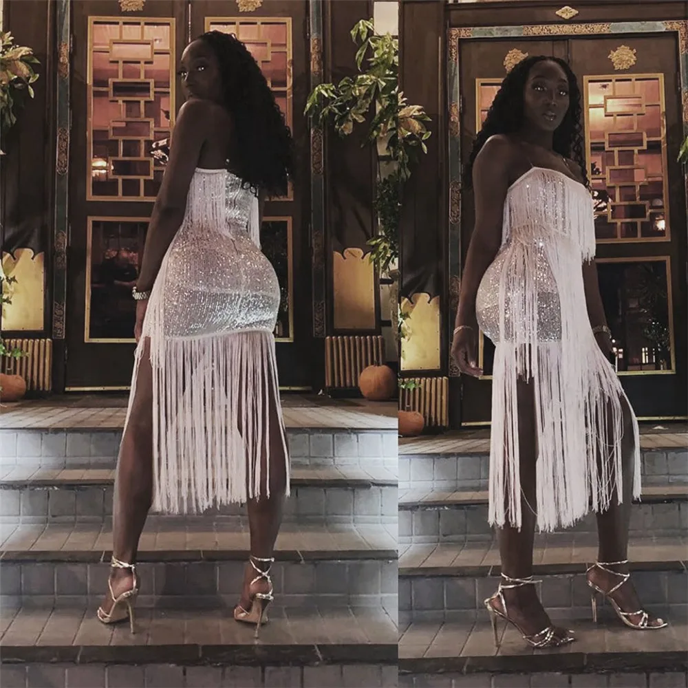 Женское роскошное блестящее платье, сексуальные Клубные платья средней длины на бретелях-спагетти с открытой спиной и бахромой, платье