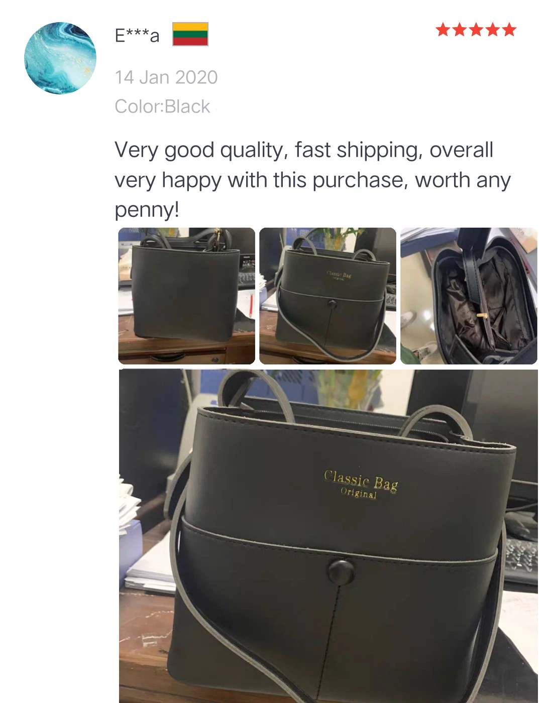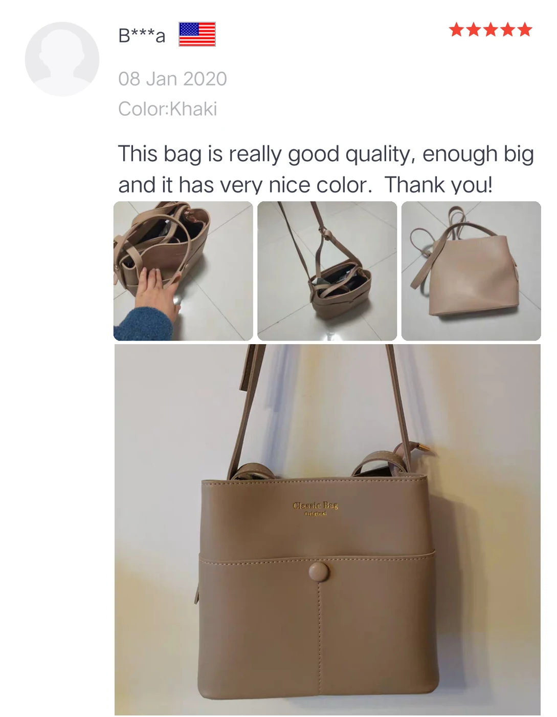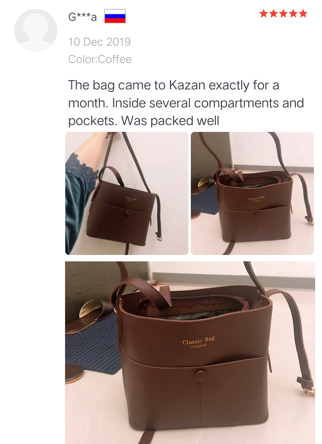 Заказ был сделан 3 октября, отправлен 8 октября, а пришёл 23 октября до Уфы. Очень довольна быстрой доставкой. Переживала, что сумка придёт с заломами, так каа отзывов много было таких. Поэтому после заказа, списалась с продавцом и попросила хорошо упоковать. Сумка пришла в идеальном состоянии: ни залома, ни ниток торчащих, ни разрезов. С замками тоже всё хорошо. Кожзам жёсткий и, честно говоря, сумка выглядит дёшево. А так в целом хорошо, рекомендую Она небольшого формата, но и не маленькая. Компактная и удобная. Длина ремня в самый раз, но он не съемный. Позже отпишусь о носке.