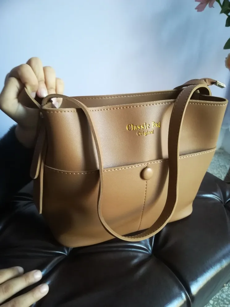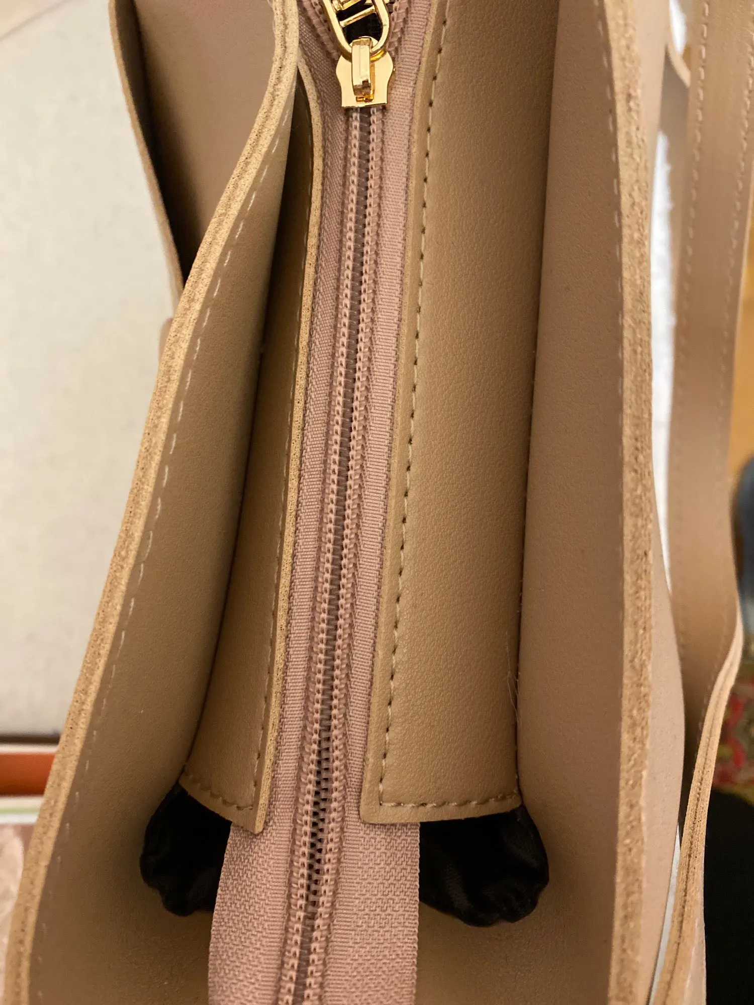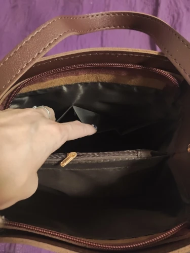 Сумка очень стильная, выглядит дорого. Швы ровные, нитки не торчат. Внутри есть кармашек на молнии. При транспортировке не помялась, продавец положил внутрь сумки воздушную подушку.