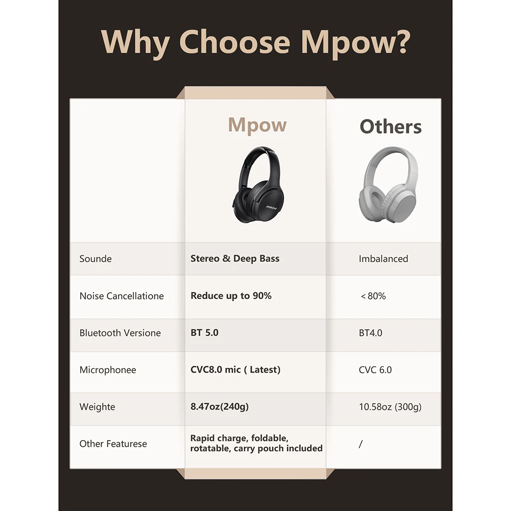 Это прекрасная компания. Я у них уже заказываю 2 наушники. Первыми были Mpow 5, я ими остался доволен, однако они через 1,5 года сломались (перестал работать один динамик через блютуз). Решил не чинить а заказать новые. Заказал Mpow H19. В сравнении с прошлыми (mpow5) эти более продуманные, удобные, имеют больший аккумулятор, более хорошое активное шумоподавления, более прочную конструкцию, более защищённые кнопки, кодек AAC. Однако есть и минусы: более тихие (без активного шумоподавления), лично мне не понравилось разположение кнопок + - (кнопка включения) мне нравилось когда было + - по бокам а кнопка включения была по средине, громкое клацанье кнопок. Моя общая оценка за удобство - 9/10 Качество - 9/10 Качество звука по отношению к цене - 10/10. Если бы у меня спросили что купить, то я б порекомендовал эту компанию и их наушники.
