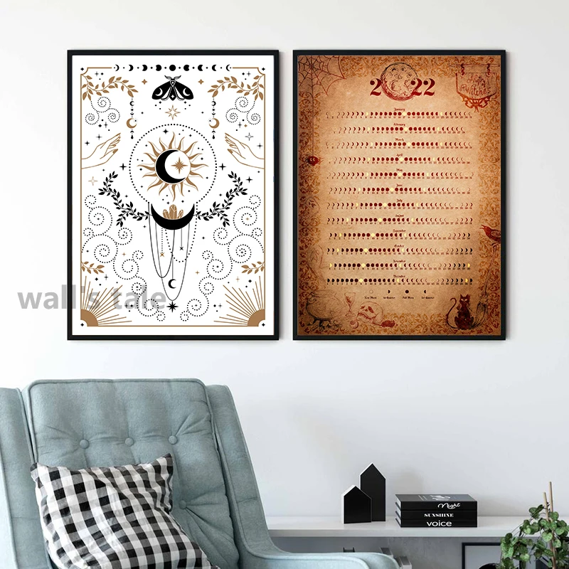 2022 г., Wicca, лунный календарь, принты, лунный плакат, лунный месяц, фазы Луны 2022, Картина на холсте для декора гостиной
