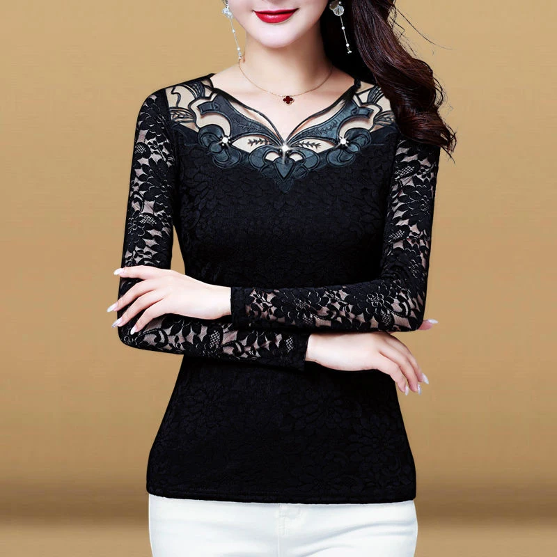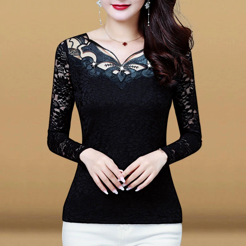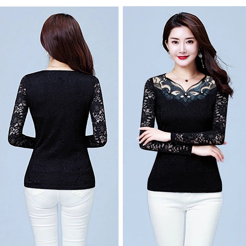 Женские весенне-осенние стильные кружевные женские Блузки Рубашки повседневные тонкие кружевные блузы с круглым вырезом и длинными рукавами DD8172