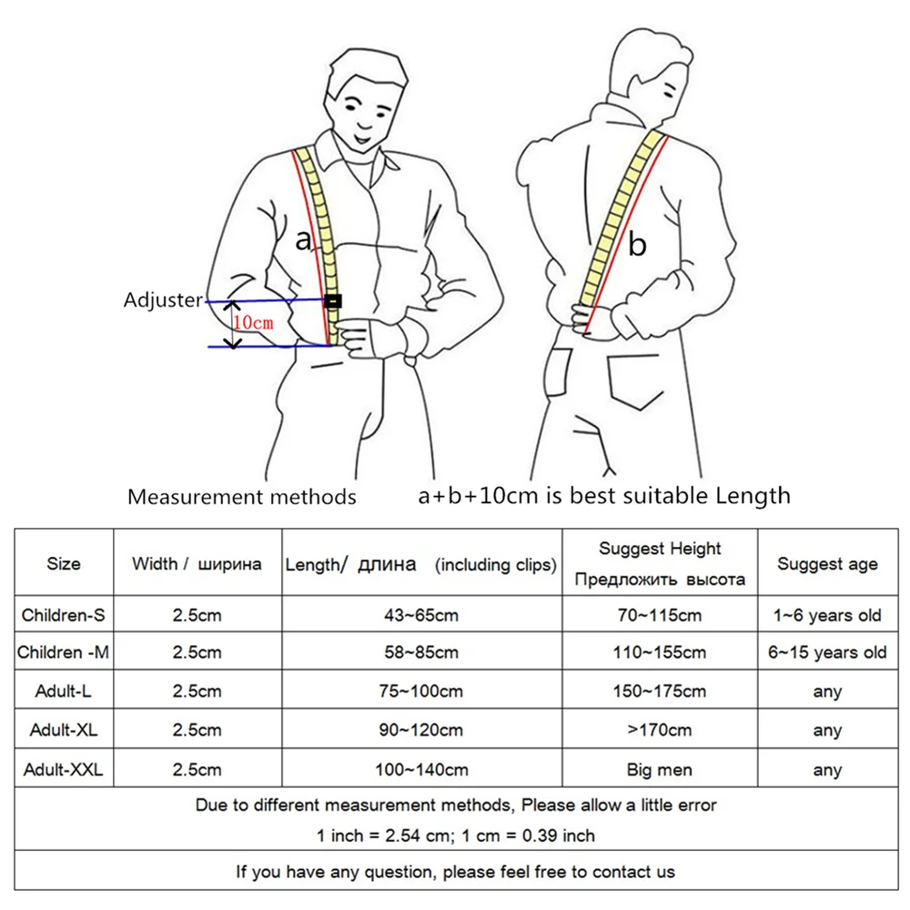 Артикул: BD2582 Детский Размер S: Ширина 2,5 см, Макс. Длина 65 см. Клипсы-вкладыши, регулируемые, для роста 70 ~ 115 см; Детский Размер M: Ширина 2,5 см, Макс. Длина 85 см. Клипсы-вкладыши, регулируемые, для роста 110 ~ 155 см; Взрослый размер L: Ширина 2,5 см, Макс. Длина 100 см. Инлькументные зажимы, регулируемые, для 130 ~ 175 см высотой; Взрослый Размер XL: ширина 2,5 см, Макс. Длина 120 см. Инлькументные клипсы, регулируемые, для роста> 175; Взрослый Размер XXL: ширина 2,5 см, Макс. Длина 140 см. Инлькулирующие клипсы, регулируемые, для больших людей; Посылка: 1 полипропиленовый пакет без платы, >1 шт. белая бумажная карточка + полипропиленовый пакет Если вам нужен другой размер, свяжитесь с продавцом Y-Обратные подтяжки из высококачественной резинки. Легко регулируется по вашим меркам 3 зажима Серебристые подтяжки легко открываются, но крепкие, не скользят 2 безопасных регулируемых регулятора и эластичные ремни для регулировки длины Высококачественная кожа соединяет подтяжки, сохраняет красивый Для любого случая; Также сделайте для великолепного подарка; Фото малыша опора; Или просто придайте им очаровательный стильный вид