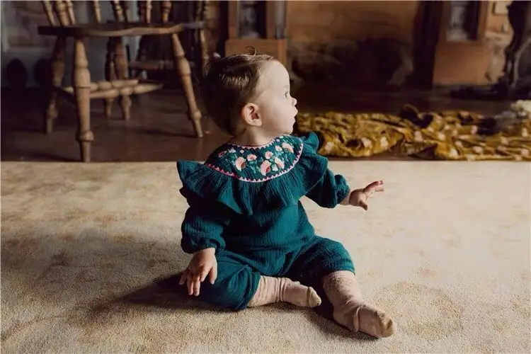 Комбинезон для новорожденных девочек 0-18 месяцев, комбинезон с цветочной вышивкой и оборками, винтажный осенне-весенний костюм с длинным рукавом для маленьких девочек