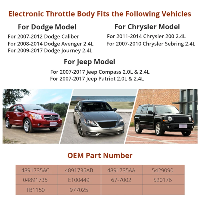 вобщем заказывал для своего джорни 2.4 2013года, как и написано в описании должно было подойти, но заслонка не подошла, бьёт ошибку и всё. спор окончился возвратом 12$, хотя с продавцом договорились за 20 (( вскрыл я это чудо китайской техники, оказалось что внутри вместо датчика положения заслонки стоит плата обманки без отверстия и ответной платы кодера на шестерне, но обманывает она очень не убедительно(( На плате написано Jeep, может для жипа и подойдёт. в целом железяка сделана не плохо, если ещё б работала вообще было бы круто, а так придется колхозить и переставлять свою электронику, может что и выйдет. Вобщем берите на свой страх и риск, кто брал на джорни отпишитесь что у вас. Всем удачных покупок и мне в следующий раз тоже))