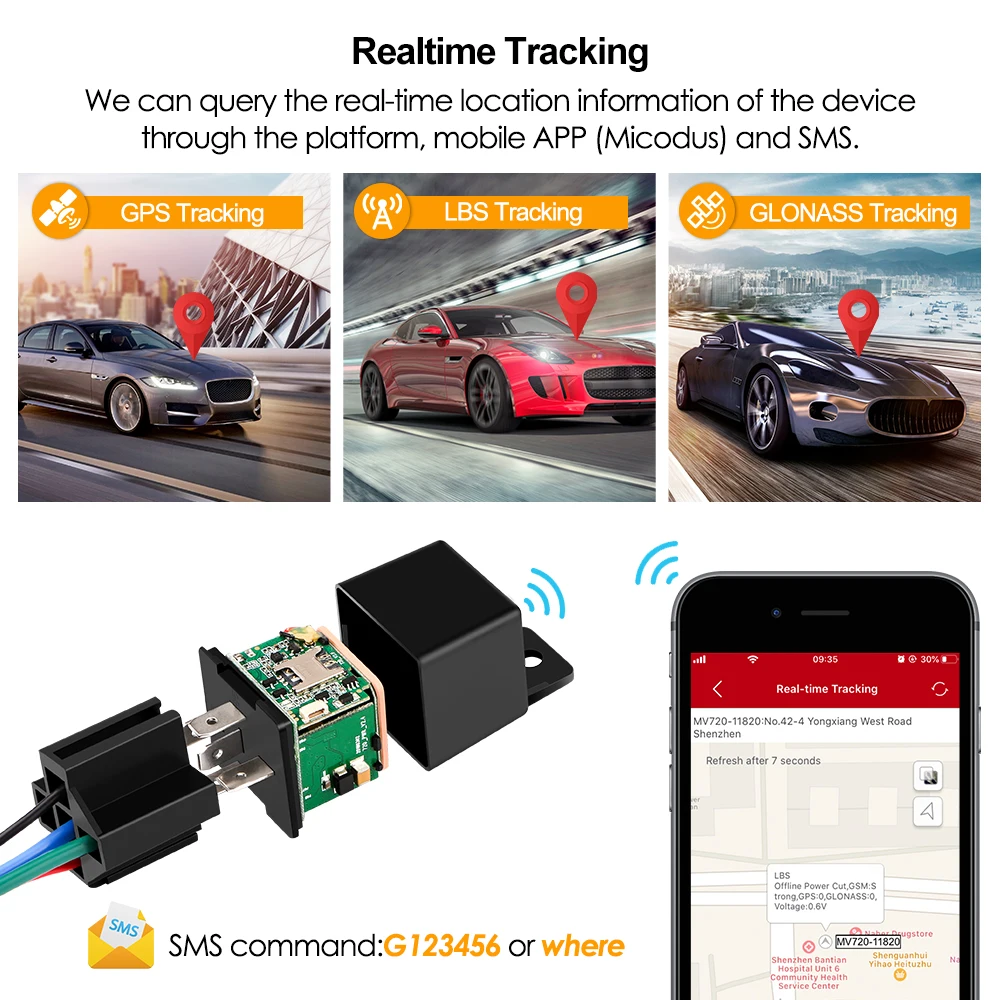 Мы можем запросить информацию о местоположении устройства в реальном времени с помощью платформы, мобильного приложения (Micodus) и SMS.Способ отслеживания: GPS + LBS + GLONASSSms-команда: G123456 или где