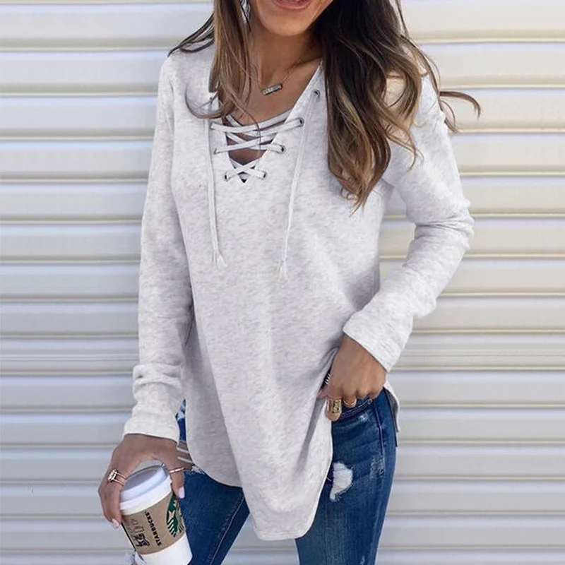 Женская толстовка со стрингами, с V-образным вырезом, свободные толстовки, осенние пуловеры, серый свитшот, Топ с длинным рукавом, стильные женские толстовки