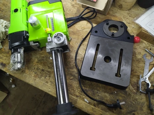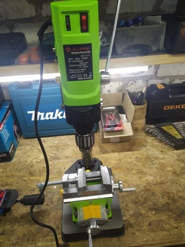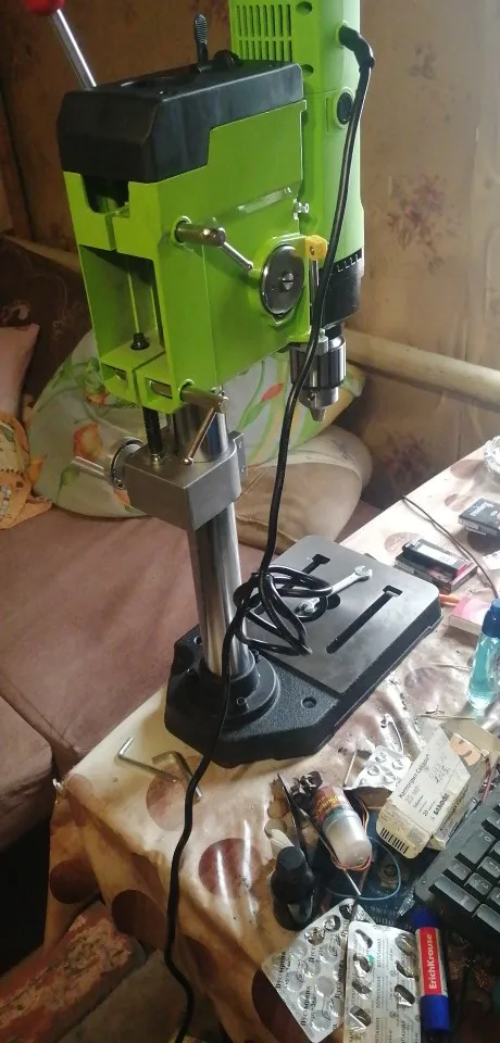 Срок доставки сильно отличается от заявленного в сторону увеличения. На станке отсутствует флажок-указатель глубины опускания дрели (об этом уже писали ранее). На низких оборотах, вращение патрона свободно останавливается рукой (кто-то написал, что не смог остановить). Хотя, у меня 880 W, может у киловаттного по-другому. В остальном, пойдёт.