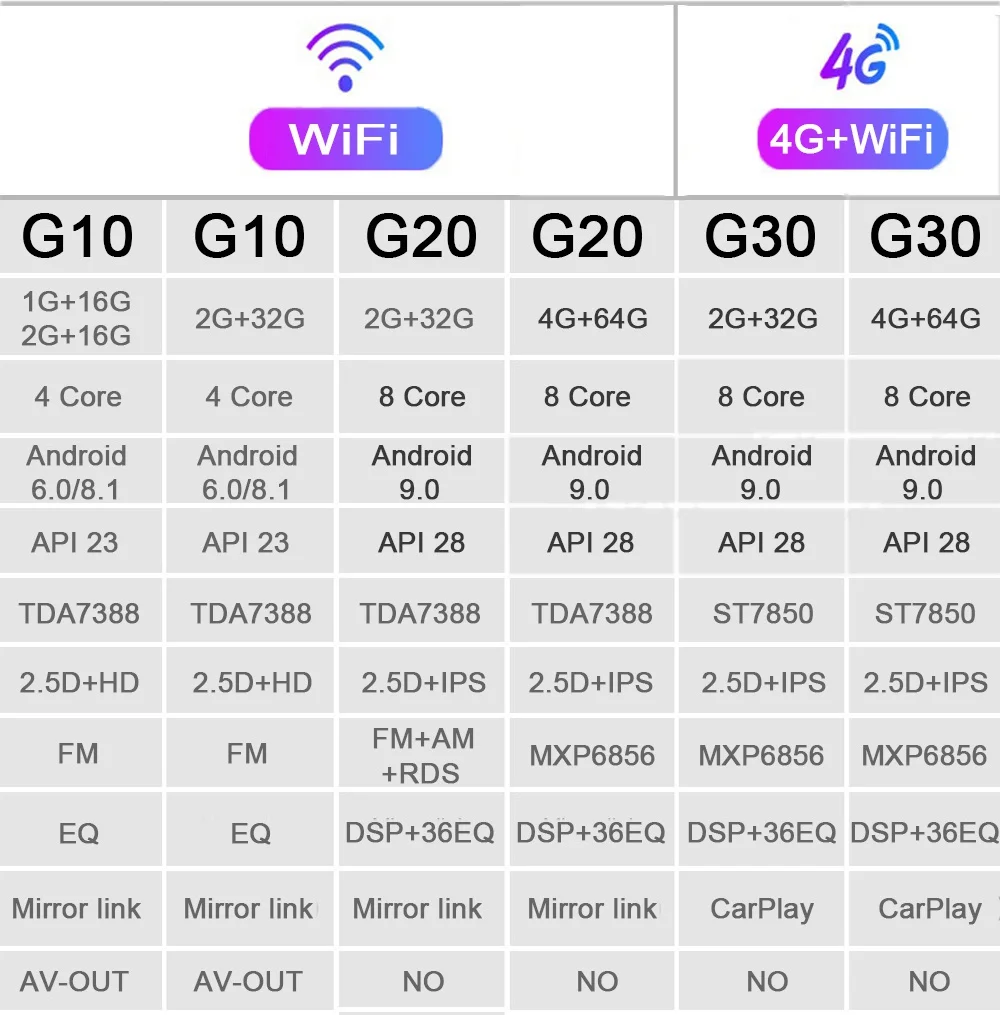 Встроенный усилитель 4*45 Вт, музыка звучит ярко, даже с большим качеством звука. Используйте полосный графический эквалайзер, чтобы настроить звук по своему вкусу. Поп, рок, джаз, классика, Плоский, пользовательский, голосовой. Множество вариантов настройки Если покупатель должен носить 36EQ + DSP, пожалуйста, приобретите версии G20 и g30.