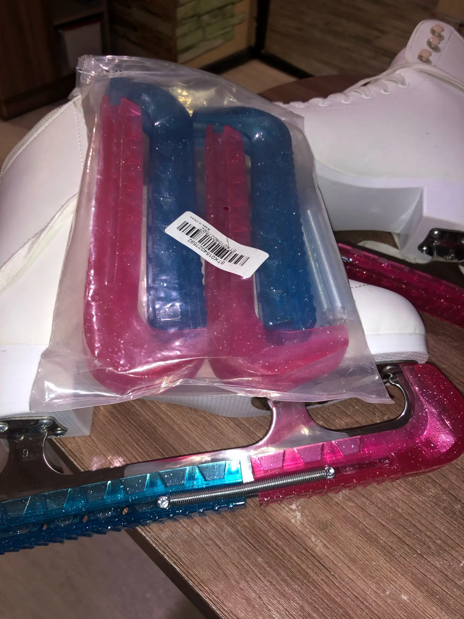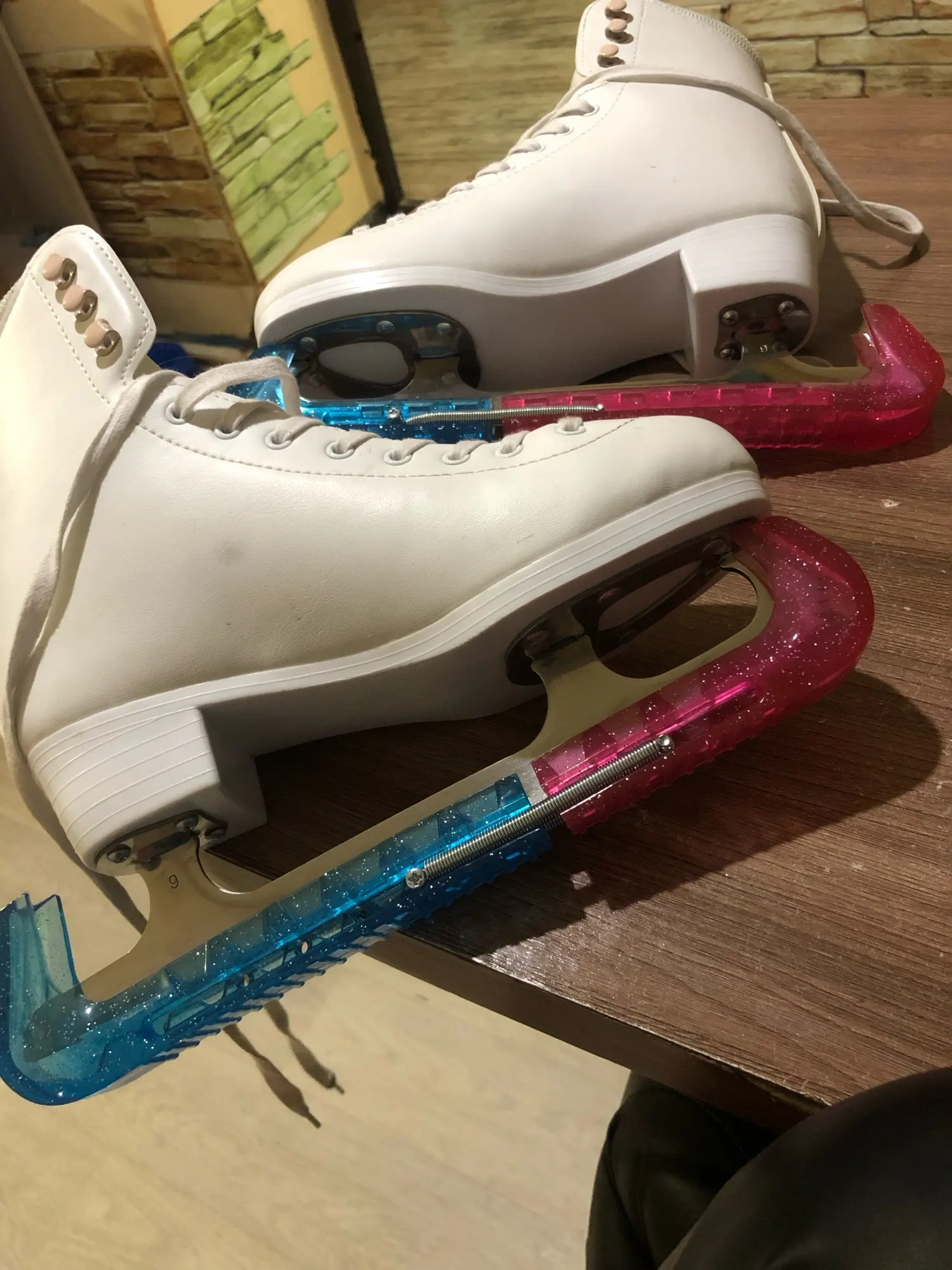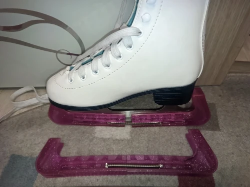 Всё отлично. Пришлось только подрезать болгаркой с одной стороны где-то на 3см для детских коньков 32 размера. Всё отлично. Удобные защитные чехлы. На фото показал как должно получиться в нормальном состоянии и как на коньках. На один чехол по две пружины, которые винтами держат друг друга.
